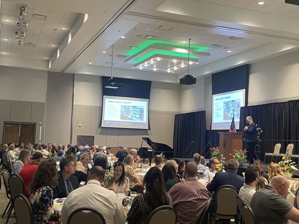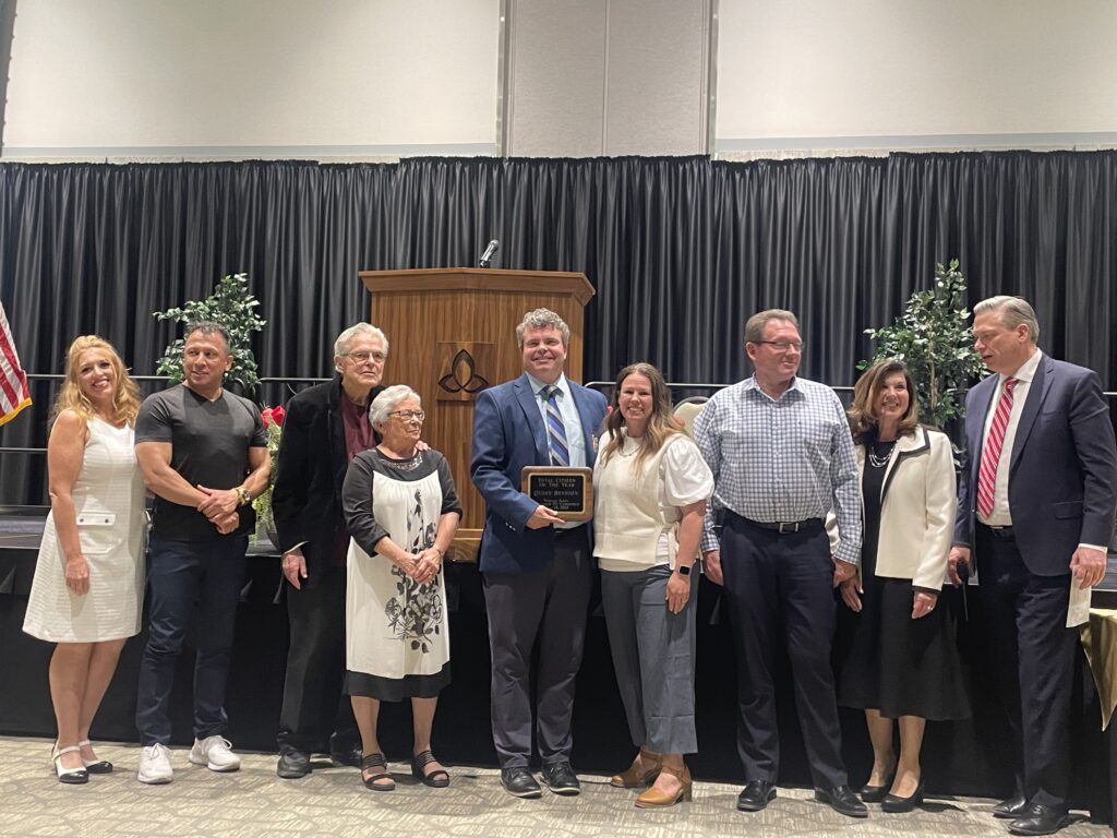 Business and local leaders gathered at the Uintah Conference Center on Thursday evening for the Vernal Area Chamber of Commerce Annual Meeting and Awards dinner. Having been established in 1949, the gathering celebrated the 75th anniversary of the organization. Utah State Treasurer Marlo Oaks was the special guest speaker and he focused his remarks on the topic of ESG which stands for Environmental Social Governance. Oaks stated that the underlying politics are not necessarily the problem but the fact that ESG is pushing politics at all is the problem. He encouraged all to become educated on what is happening to change the economic system. The meeting presented a variety of awards, including five Businesses of the Year: Four Star Ranch in Agriculture, the Uintah Basin Association of Government in Government, Greylock Energy in Manufacturing/Industry, B&D RV Sales and Service in Retail/Wholesale, and V6 Media in Service. Vernal City Manager Quinn Bennion was named the Total Citizen of the Year. The meeting wrapped up with some business items but not before a special recognition was given to someone retiring after many years of very active involvement in and working for the Vernal Area Chamber. The stage filled with the Dinah-Mite members as Marilyn Wallis was called up front to be thanked for her years of service and all she has done for the Vernal community over 24 years of involvement with the Chamber.