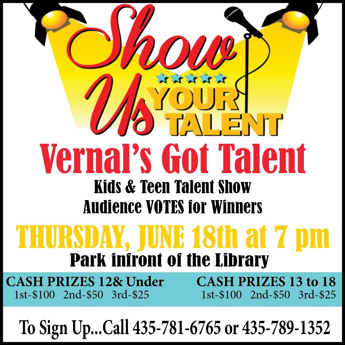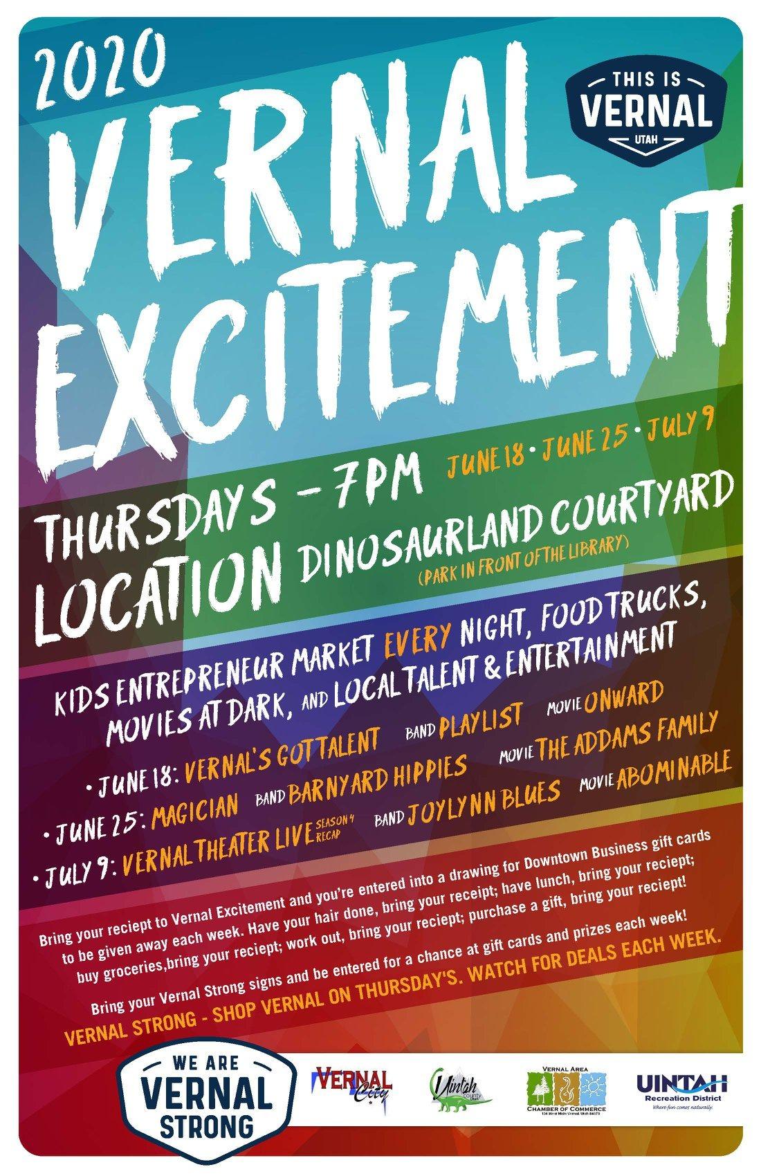 Vernal Excitement will start with a bang tonight in the Dinosaurland Courtyard in front of the Uintah County Library. As in year’s past, Vernal Excitement takes place on Thursdays starting at 7pm and includes Kids Entrepreneur Market, food trucks, movies at dark, and entertainment. Tonight’s entertainment is Vernal’s Got Talent, a kids and teen talent show and the audience votes for the winners with the top 3 in each group receiving cash prizes! This year will also include the Shop Local drawing. Bring your receipts from shopping local and be entered to win prizes. The movie at dark will be Disney’s ‘Onward’. Vernal Excitement will be held June 18th, 25th, and July 9th.