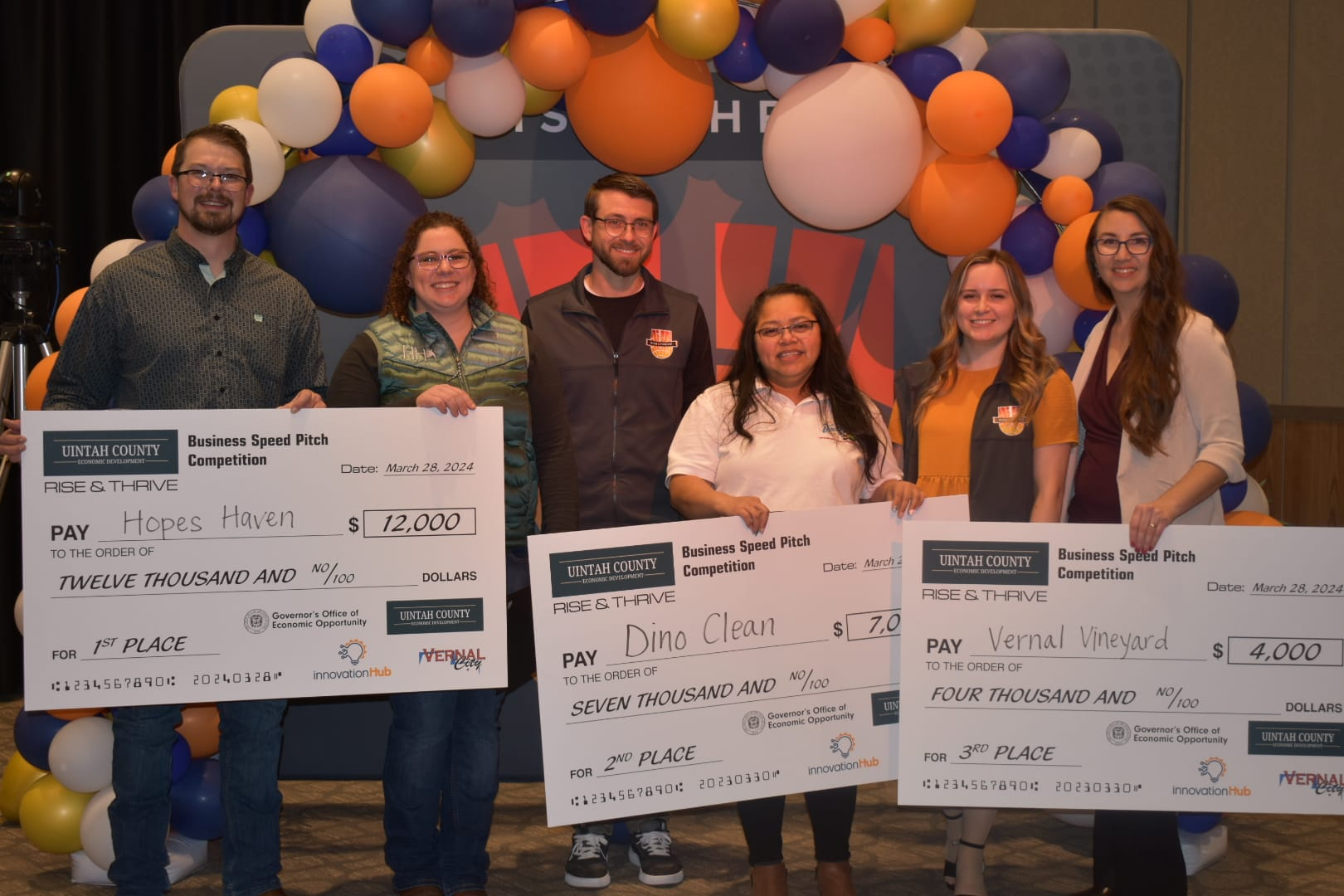It was another exciting and successful Rise and Thrive Business Speed Pitch Competition that took place at the Uintah Conference Center last week. The 1st place award went to Shay and Taylor Densley with Hopes Haven, an organization that uses horses to facilitate mental health therapy sessions. Hopes Haven received $12,000 dollars toward their business idea. The 2nd place winner was Nelly Gomez with Dino Clean with an award of $7,000 dollars. The 3rd place winner was Amanda Jenkins with Vernal Vineyard with an award of $4,000 dollars. The People’s Choice Award was presented to Ambryn and Brytin Jackson with their product Squeaky Soap. It was a fun and impressive evening for all the participants and those in attendance.