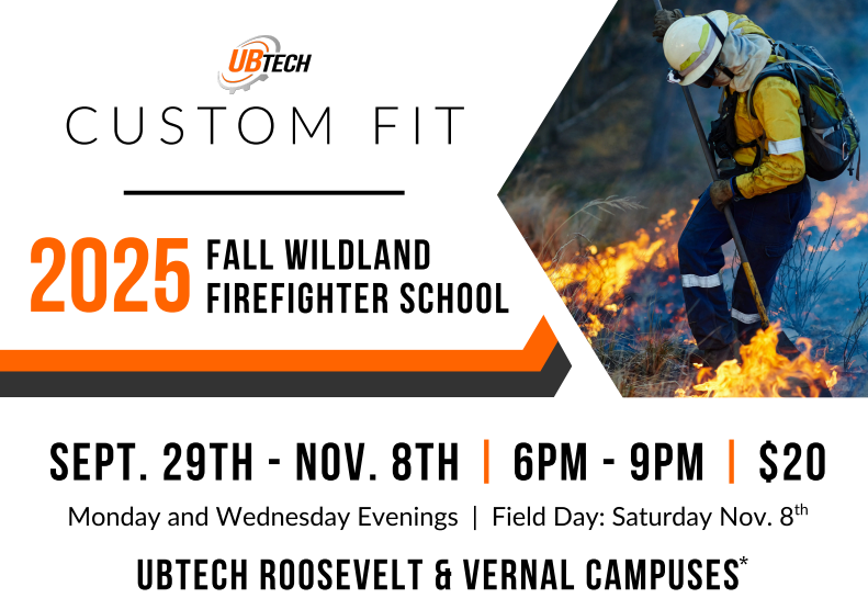 Local, state, and federal firefighting agencies are once again partnering with UBTech to offer the Fall Wildland Firefighting School. “Bringing this training to the Uintah Basin directly benefits our communities by strengthening wildfire response capabilities at a time when wildfires are becoming increasingly frequent,” shares Travis Hawkins with BLM Fire Prevention and Mitigation. “Conducting the school locally ensures firefighters are well-prepared and safe, communities are protected, and agencies across the region are equipped to respond effectively when the next wildland fire strikes.” Students that complete the program earn the certifications required to apply for firefighting positions at the local, state, and national levels. The course will run September 29th through November 8th on Monday and Wednesday evenings at both the UBTech Vernal and Roosevelt campuses if minimum enrollment numbers are met. Visit www.UBTech.edu/custom-fit for more information.