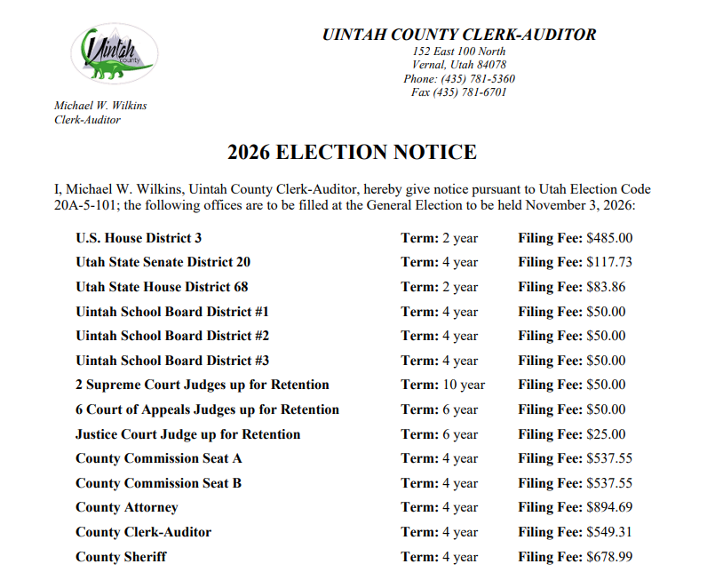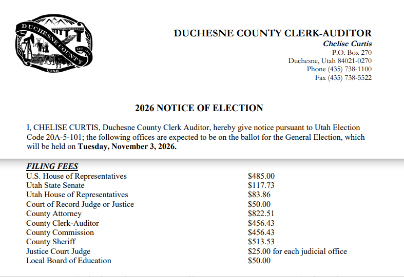 Candidacy filing dates are approaching for the 2026 General Election. In both Duchesne County and Uintah County, the local offices to be filled in the 2026 General Election include School Board Districts 1, 2, and 3; County Commission Seat A and B; County Attorney, County Clerk-Auditor, and County Sheriff. There are also openings for Utah State Senate District 20 and Utah State House District 68 as well as several Appeals and Supreme Court Judges up for retention. In Uintah County, there will also be U.S. House District 2 and in Duchesne County, U.S. House District 3 and Utah State House District 67. Candidacy filing for all offices will be open January 2nd through January 8th. Filing fees vary depending on the office but are listed in the 2026 Election Notice for each county. The amount charged for the filing fee is based on an equation determined by the Office of the Lieutenant Governor. For all County Offices, the filing fee is 1/8th of 1% of the total salary for the full term of office for each respective position, plus $50. For local county offices, this can vary between $450 to nearly $900 depending on the salary attached to the county office.