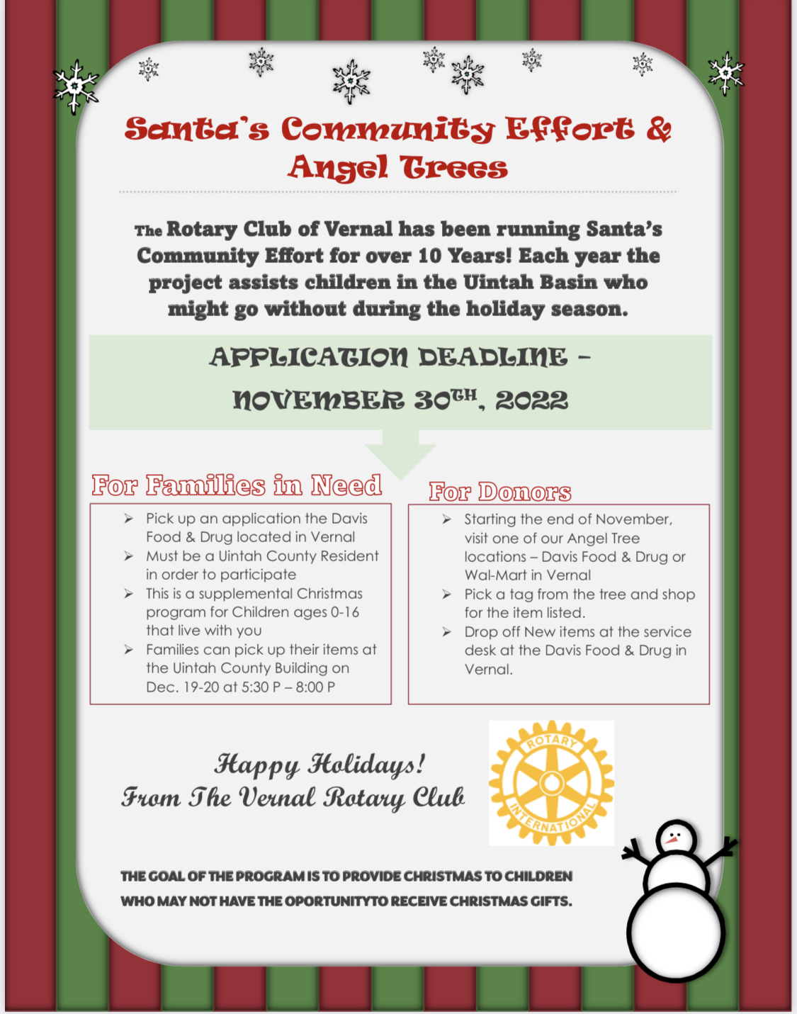 For over 10 years, the Rotary Club of Vernal has been running Santa’s Community Effort and they are ready for this holiday season. The effort is a supplemental Christmas program to help kids zero to age 16 have a nice Christmas they otherwise would not have had. Applications for families in need are now open. If you are a family in need with kids 16 and younger, pick up an application at the Davis Food and Drug in Vernal. This project is for Uintah County residents with children that live with them. The deadline to apply is Wednesday, November 30th. This is when the Angel Trees get set up at each entrance to Walmart, making it an easy place to pick up a tag, shop, and be ready to drop off the items at Davis Food and Drug. Items for families will be available for pick up December 19th and 20th at the Uintah County building from 5:30pm to 8pm.