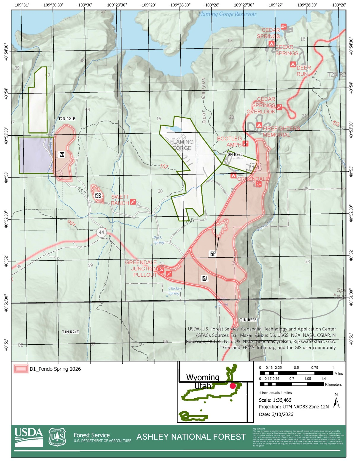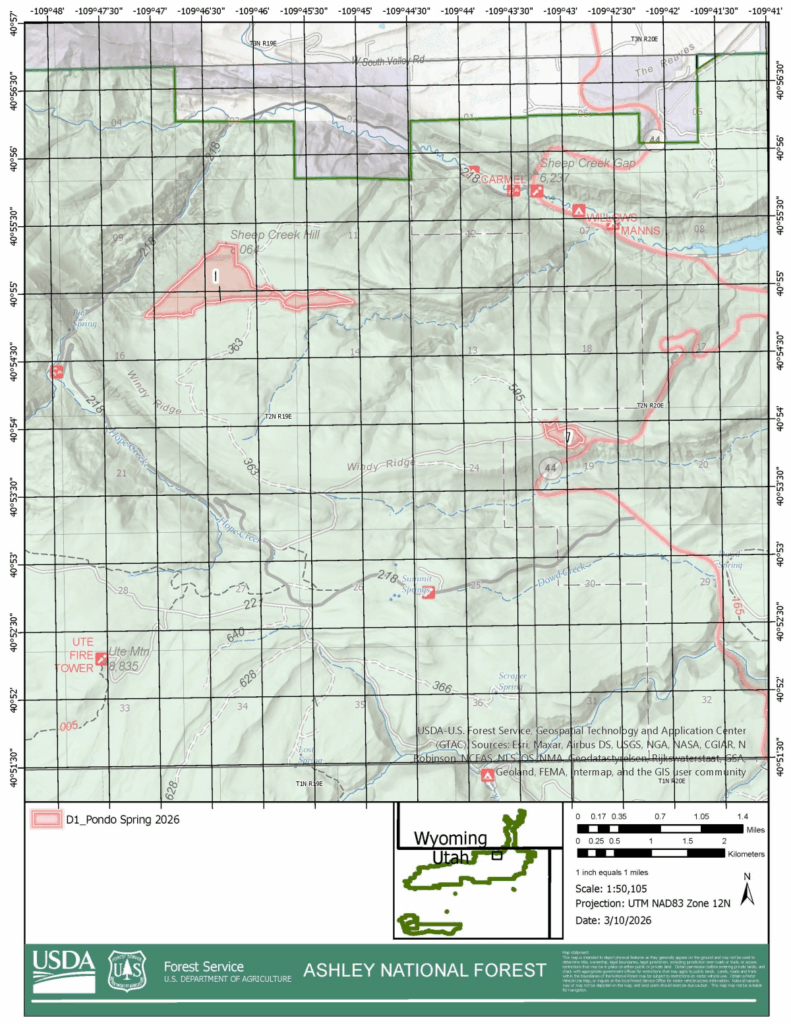 Ashley National Forest has announced plans for prescribed fire operations this spring. Prescribed fires planned for the area include the D1 Ponderosa Pine Maintenance and Fuels Reduction Project which consists of areas around the Sheep Creek Geological Loop, areas north of the Greendale Overlook, and areas east of Highway 191 adjacent to Cart Creek. Those areas may close to the public for several days for public safety. Watch for warning signs along roads near all prescribed fire areas before and during burns. Residents may experience smoke during the prescribed burns. Go to AirNow to find more detailed information about air quality. It’s estimated the work will continue into the first week of April as weather conditions allow. For more information, call the Ashley Supervisors Office at 435-781-1181.