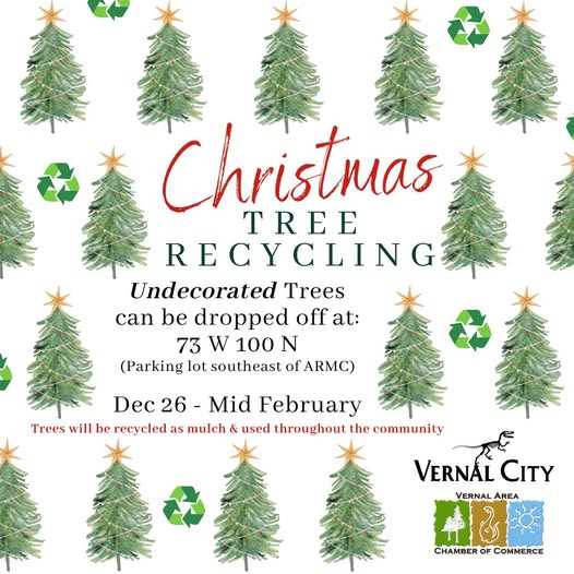 Christmas is technically over but whether you are ready to clean up the tree right away or enjoy letting the season linger, the Christmas Tree Recycling Program is available in Vernal City. It’s simple: When you are ready, drop off your undecorated real tree at 73 West 100 North. “Vernal City will be grinding up your old trees and turning them into mulch, which will be used to beautify and improve our community,” shares the announcement. “The mulch will be used to support local landscaping projects throughout [Vernal City]. It’s a simple way to give back to the community and keep the holiday spirit alive.” This service is available now and runs through mid-February.