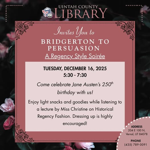 December is hopping at the Uintah County Library. As you might expect, Santa has been at the library along with other holiday activities so far but there’s more than just holly jolly activities this month. In fact, this month on December 16th, the Uintah County Library is hosting a Bridgerton To Persuasion Regency Style event. This is to celebrate Jane Austen’s 250th birthday with light snacks while listening to a lecture by Miss Christine on Historical Regency Fashion. Dressing up is highly encouraged! The library has also added a new storytime this month called Stories and Stuffies. This is a chance for your little one to bring their favorite teddy bear, dinosaur, or creature to come enjoy a story or two on Tuesdays at 1pm. And as always, the Uintah County Library hosts the Kids Cafe Monday through Thursday 3:30 to 4:30pm and Friday and Saturday 2:00 to 3:00pm for kids to come eat a free meal, courtesy of the Utah Food Bank. Stay up to date on the happenings at the Uintah County Library by following their Facebook page.