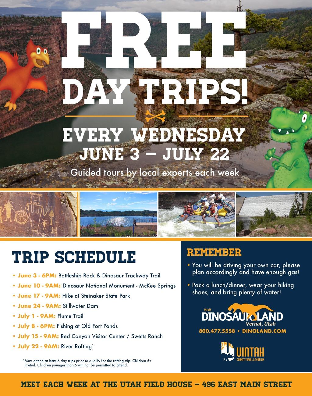 The Uintah Basin has many hidden treasures of outdoor adventures. In an effort to help people to explore what the Basin offers, Uintah County Travel and Tourism is starting their Free Day Trips. They will be happening every Wednesday starting on June 3rd and going until July 22nd. The adventures start with a trip to Battleship Rock and Dinosaur Trackway Trail. Meet at the Utah Field House Wednesday at 6pm. There will be a local expert that will act as a guide. Individuals and families will need to bring and drive their own car so plan gas accordingly. Bring a dinner, hiking boots, and plenty of water.