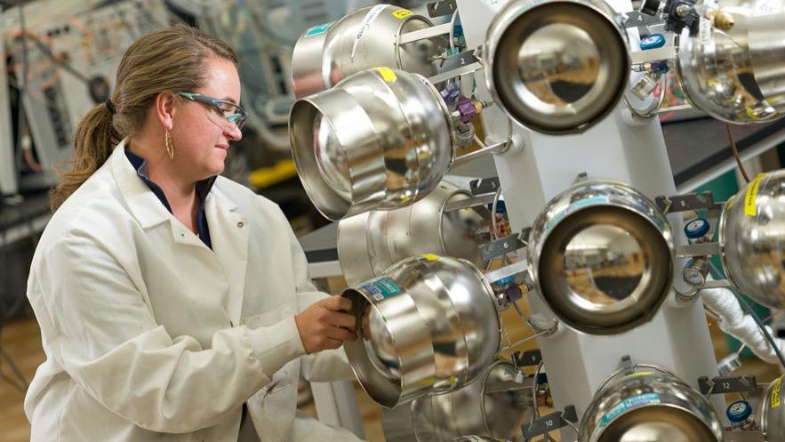 Uintah Basin biology student Makenzie Holmes, who works with Seth Lyman, prepares air samples to be analyzed for atmospheric pollutants that contribute to wintertime ozone.