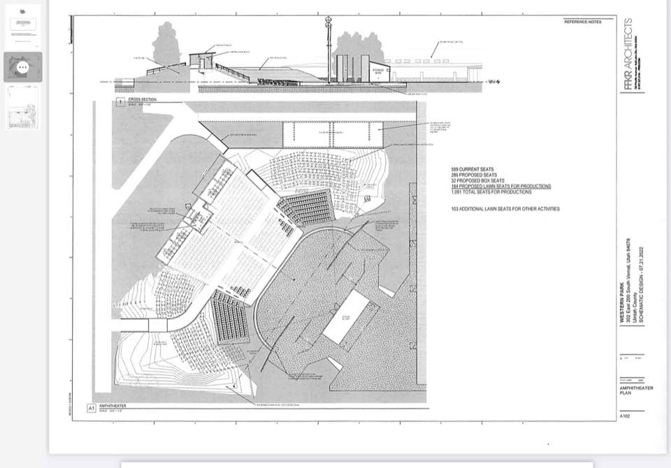 Planning continues on the remodel proposed for the Western Park ice rink and Outlaw Trail Amphitheater. Uintah County announced the project last spring and at the time Commissioner Haslem stated that there are no local tax dollars involved, only federal grant money. The latest plans show that tentatively, the berm will be all around both sides of the amphitheater stage to help block out the grandstand noises and the street on the north side. Additional seats will be added. The light and sound booth at the top will be expanded and box seats added. The berm would cover the existing entrance sidewalks and form tunnels on either side so the stage is ‘revealed’ when you come out of the tunnel. The stage will be rebuilt to be one level, wider and not so deep. There will be permanent wings built and a storage/set building at the back. The ice rink upgrade will provide meeting rooms and bathrooms that will be accessible from the outside.