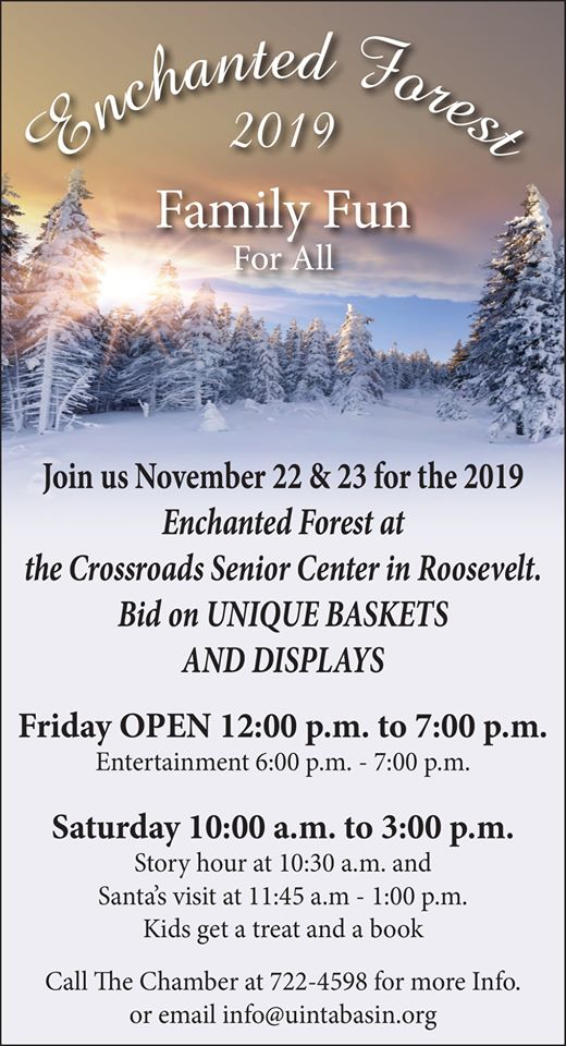 The Uintah Basin is known for having a capricorn of holiday traditions that overflows our hearts with gratitude. One such tradition is the Duchesne County ENCHANTED FOREST. Last year’s event was a success with 21 trees raising $120,000 dollars for local charities. An additional $30,000 dollars were raised in tree sponsorships as well as another $10,000 dollars on the silent auction items. A ‘Story Hour with Santa’ as part of the event was also a success with 250 kids in attendance. This year they hope to continue that tradition of giving. This year’s Enchanted Forest will be held on Friday, November 22nd and Saturday, November 23rd at the Crossroads Senior Center. The event will feature the opportunity for people to admire the decorated Christmas Trees that are being bid on, unique gift baskets to also bid on, a two day bake sale, and family fun. The center opens at 12pm on Friday and runs until 7pm with some entertainment from 6pm to closing. Saturday goes from 10am to 3pm with a Story Hour at 10:30am. The little ones can also plan on seeing Santa from 11:45am to 1pm along with a free treat and book.