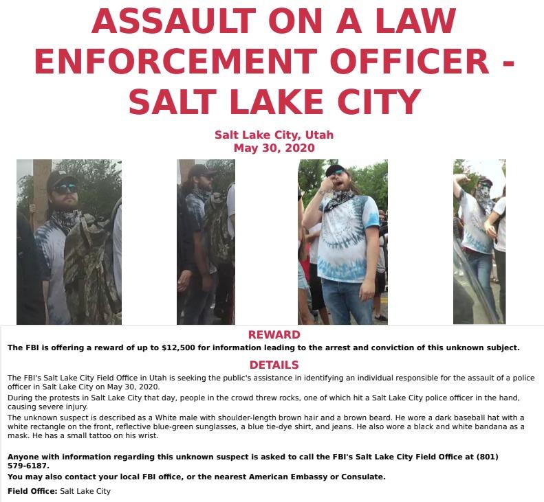 The FBI announced Thursday that they are offering a reward of up to $12,500 dollars for information leading to the arrest and conviction of an unidentified male who assaulted a police officer during the Salt Lake City protests on May 30th. During the protests that day, a man in the crowd threw a rock that hit a Salt Lake City police officer in the hand, causing severe injury. The suspect is described as a white male with shoulder-length brown hair and a brown beard wearing a dark baseball hat with a white rectangle on the front, reflective blue-green sunglasses, a blue tie-dye shirt, jeans, and a black and white bandana as a mask. He also has a small tattoo on his wrist. Anyone with information on this suspect is asked to call the FBI Field Office at 801-579-6187. Pictures of the suspect can be viewed on the story link on www.BasinNow.com.