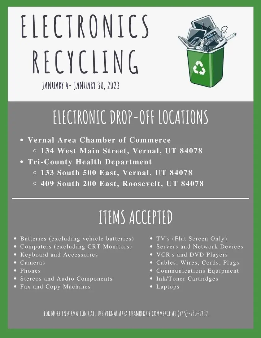 If decluttering is on your to-do list listen up. This is the last week for the annual Electronics Recycling event. Electronic drop-off locations include the Vernal Chamber Office and TriCounty Health Department in Vernal and Roosevelt. Items being accepted are keyboards, accessories, cameras, phones, stereos and audio components, fax and copy machines, TV’s(flat screen only), network devices, servers, VCRs and DVD players, cables/wires/cords/plugs, communication equipment, ink/toner cartridges, laptops, batteries(but not vehicle batteries), and computers(but not CRT monitors). The drop off locations are the Vernal Chamber Office and TriCounty Health Department in Vernal and Roosevelt. Please drop off any items to recycle by Friday, January 27th by 5:00pm.