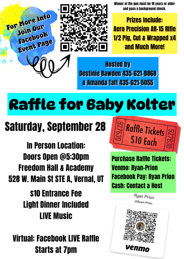 A fundraiser is being held Saturday evening to benefit an adorable community member. At just 3 weeks old, baby Kolter was rushed to the hospital because he was turning blue. He was treated for pneumonia but was not getting better. His condition worsened and the doctors concluded he was showing symptoms of Infant Botulism. The treatment has been long and hard for the little guy and he is now on a feeding tube and having problems with swallowing. He has been in the hospital for several months and will remain for as long as it takes for his body to recover and be out of danger. A raffle has been organized with the fundraising event this Saturday, September 28th, at the Freedom Hall & Academy in Vernal. There will be a $10 dollar entrance fee that includes a light dinner. Raffle tickets are $10 each and prizes include an Aero Precision AR-15 Rifle and more. You do not have to be present to win and can purchase tickets ahead of time or at the event. For more information, visit the Raffle for Baby Kolter Facebook event page or reach out to Destinie Bawden at 435-621-8868. Doors open at 5:30pm Saturday at the Freedom Hall, 528 West Main Suite A, and the raffle, which will also be broadcast LIVE on Facebook, starts at 7.