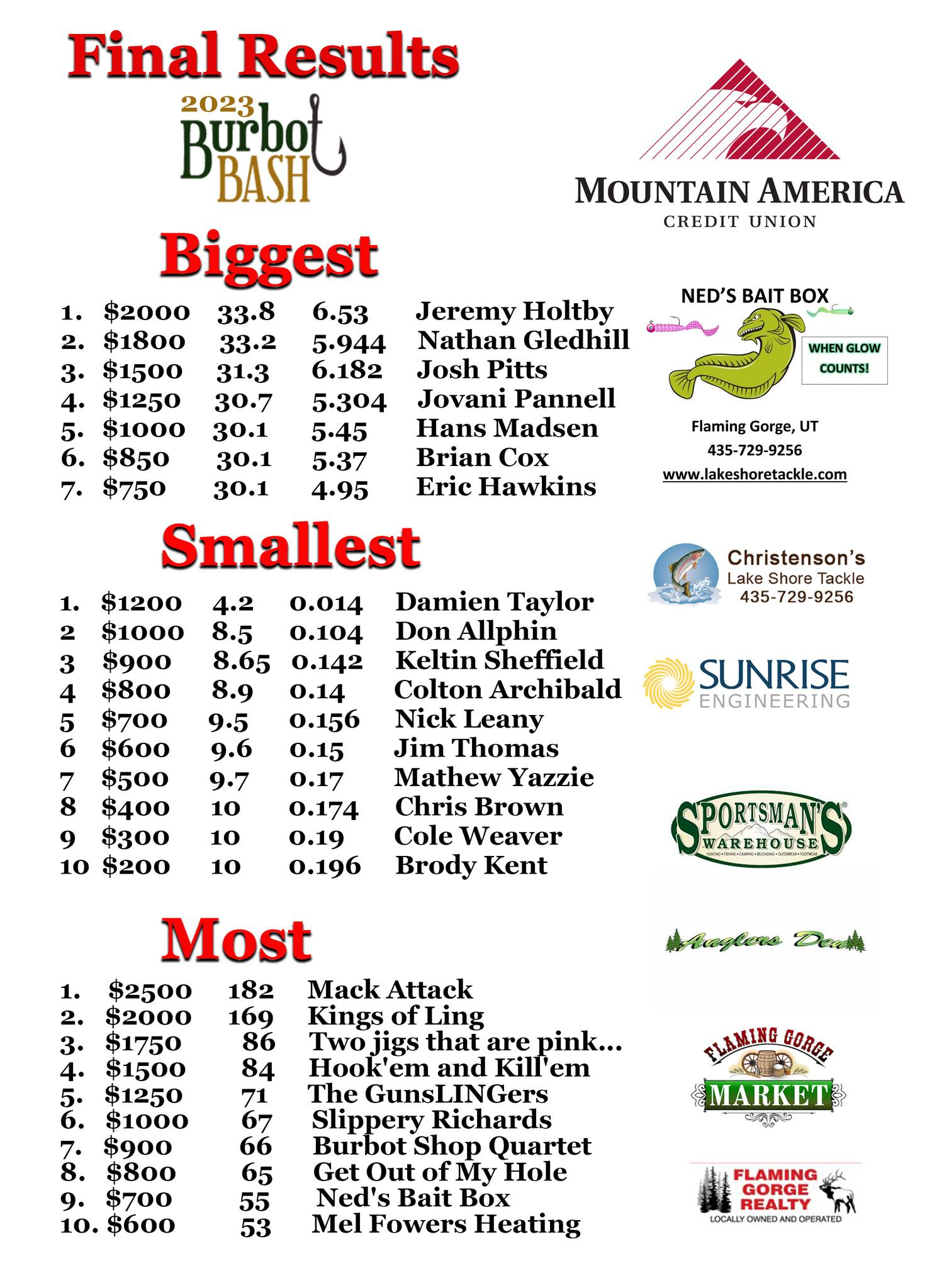 The Burbot Bash, held on Flaming Gorge Reservoir over the weekend, was a success. There were 321 teams that caught a total of about 2,700 burbot during the event. $50,000 dollars in cash and prizes were given away. The team winners for Most Burbot caught were Mack Attack with 182, Kings of Ling with 169, and Two Jigs That Are Pink with 86. Winners for Biggest Burbot caught were Jeremy Holtby with 33.8 inches, Nathan Gledhill with 33.2 inches, and Josh Pitts with 31.3 inches. Winners for Smallest Burbot caught were Damien Taylor with 4.2 inches, Don Allphin with 8.5 inches, and Keltin Sheffield with 8.65 inches. Burbot are an invasive species having a devastating effect on the Flaming Gorge fishery and the Burbot Bash aims to make a dent in the burbot population each year.
