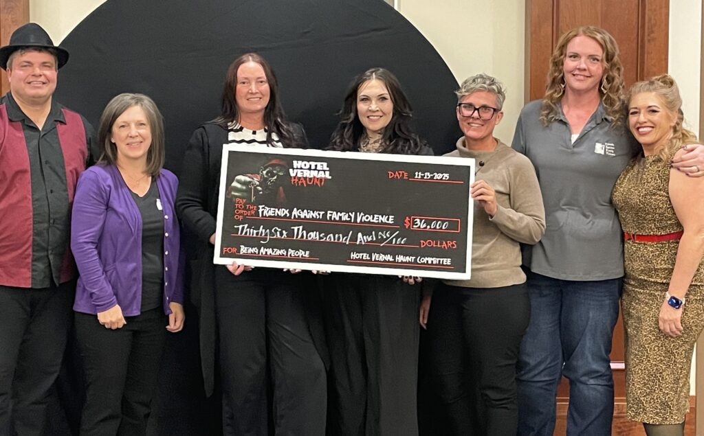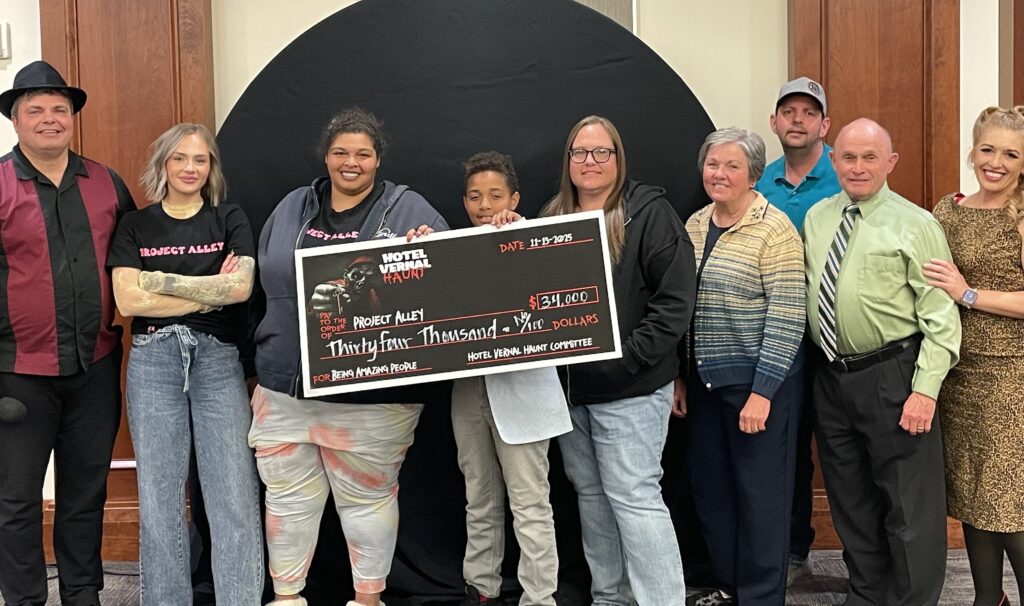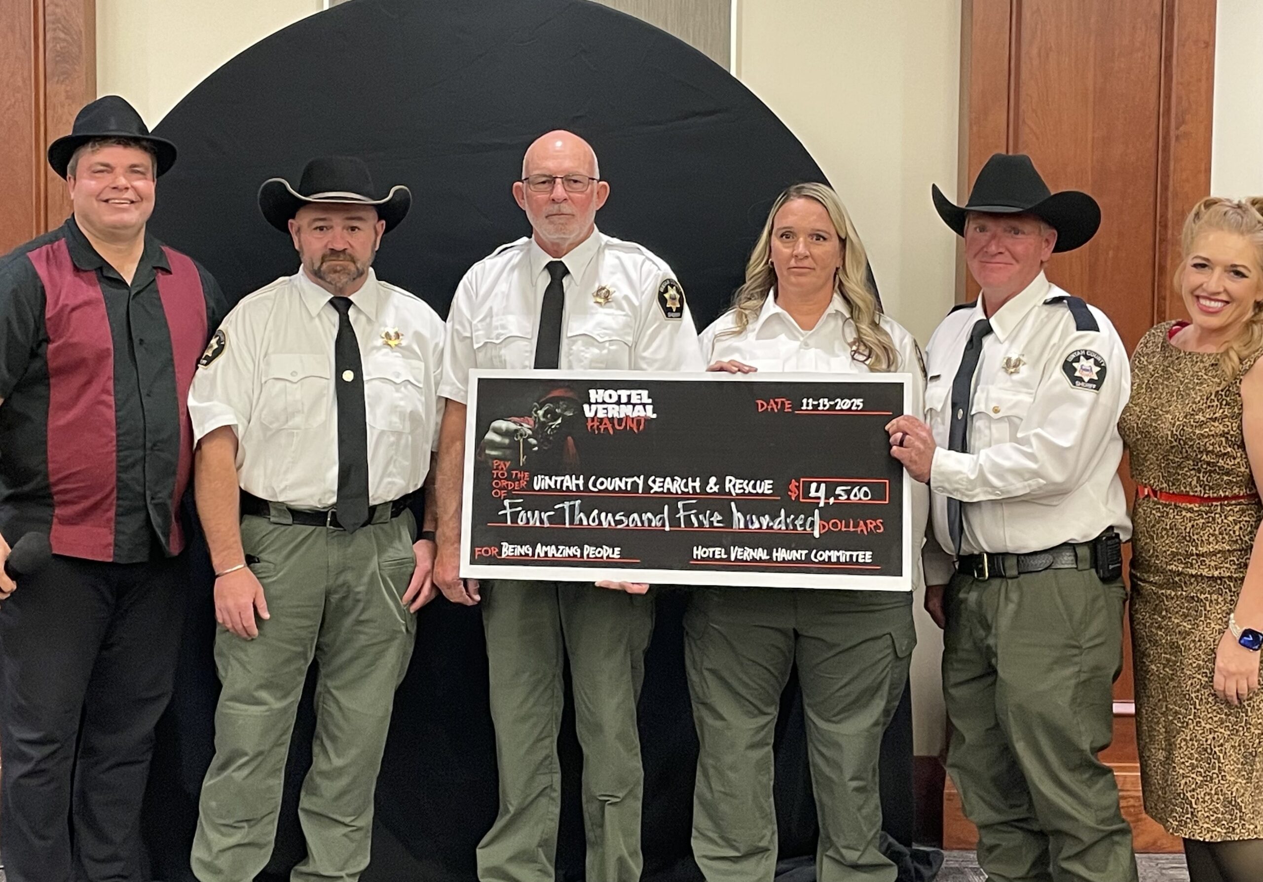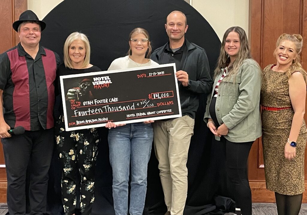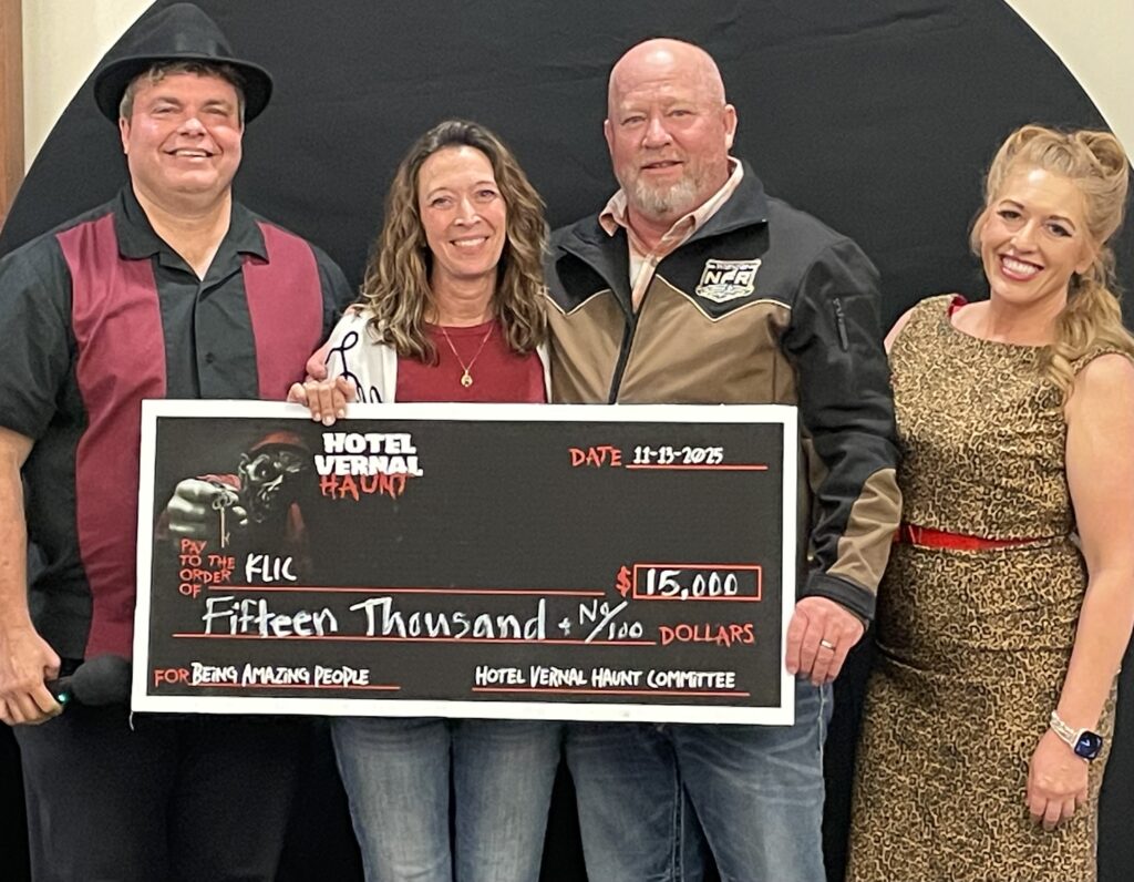 The hard work, selfless service, and spooky skills of hundreds of locals was celebrated last night at the record breaking announcement of the 2025 Hotel Vernal Haunt’s record breaking results. The 10 nights of the Haunt shattered the previous record in 2023 of $73,000 by raising a mind blowing $103,500 during this year’s events. This brings the total raised by the Hotel Vernal Haunt to $454,000 since its first year in 2018. During last night’s banquet celebration, it was shared that it was also a record breaking year for sponsors with 113 sponsorships and each sponsor’s name was read out loud. This year’s Haunt had over 300 volunteers who gave an accumulated 8,000 volunteer hours. Many of those volunteers gave more than just their time as they were the targets of zombie paintball during which over 1000 shooters fired off an estimated 165,000 paintballs. The most powerful moments of the night were the presenting of the checks to the recipient charities, each of whom dedicated many hours to the success of this year’s Haunt. Checks were presented to Uintah County Search and Rescue for $4,500 dollars, Utah Foster Care for $14,000 dollars, KLIC(Keeping Love In Communities) for $15,000 dollars, Project Alley for $34,000 dollars, and Friends Against Family Violence for $36,000 dollars. The evening was a powerful reminder of the amazing good that can be accomplished when working together.