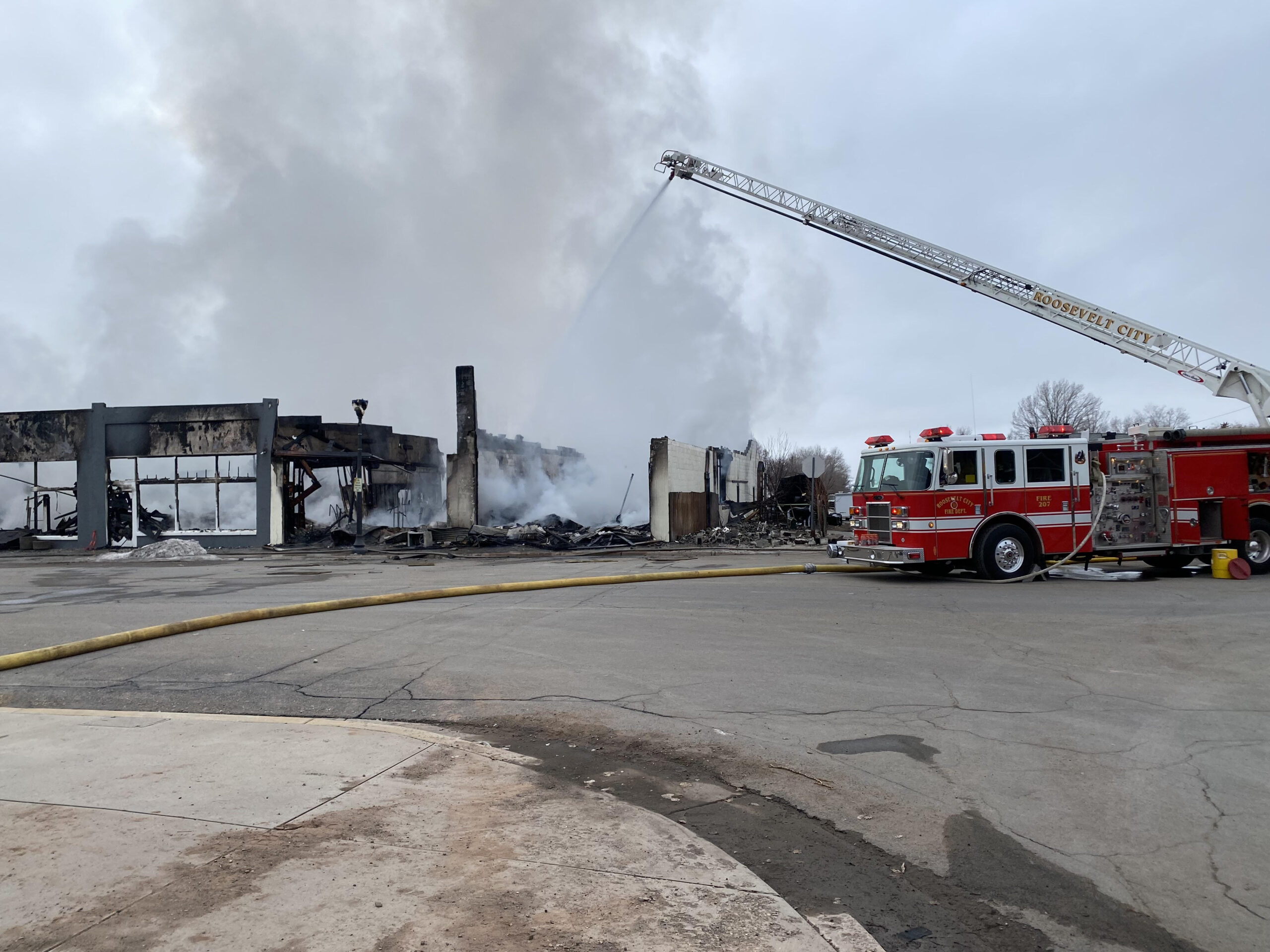 The investigation into the cause of the commercial fire that destroyed two Roosevelt businesses on Friday has found no sign of foul play in the tragedy. Assistant Roosevelt Fire Chief Nathan Goodrich shares that the fire call came in at 3:57am on March 24th and 9 firefighters responded with 2 trucks to Lagoon Street. 3 more firefighters eventually joined with 2 more trucks for a long day of battling the blaze and ensuring it didn’t spread. In the end, the ‘Second Time Around’ vintage store and one of the Marsen buildings were a complete loss. Thankfully, there were no serious injuries reported but the owner of Second Time Around was in the building at the time of the fire as his residence was the apartment in the back. He and the other tenant woke up in time and got out safely though it was a long, terrible day as the building burned until it collapsed in on itself. The Utah Fire Marshal responded to investigate and Assistant Fire Chief Goodrich shared with Evans Family Media that it was determined that the fire was unintentional and likely due to an electrical problem. Investigators found that the fire started in the front of the building inside the open shared attic. Electrical wires were found with electrical burns which means there was a short in the wire somewhere to start the fire. Goodrich says that Roosevelt Fire will continue to check on the burn site as it will likely smolder for most of this week. He also extended his thanks to the community for their outpouring of love and support, not only to the people who lost their businesses, but to the fire department as well. Goodrich says it would be difficult to make an estimate on the value of what was lost but that he knows that just the stock in the Marsens showroom alone was well over half a million dollars and the entire loss would be many multiples of that. Roosevelt City issued their own press release regarding the fire calling it a loss for Roosevelt City as a whole and expressing condolences to the business owners and gratitude for the fire fighters. The buildings were a total loss and any new updates on the fire will be provided as they become available.