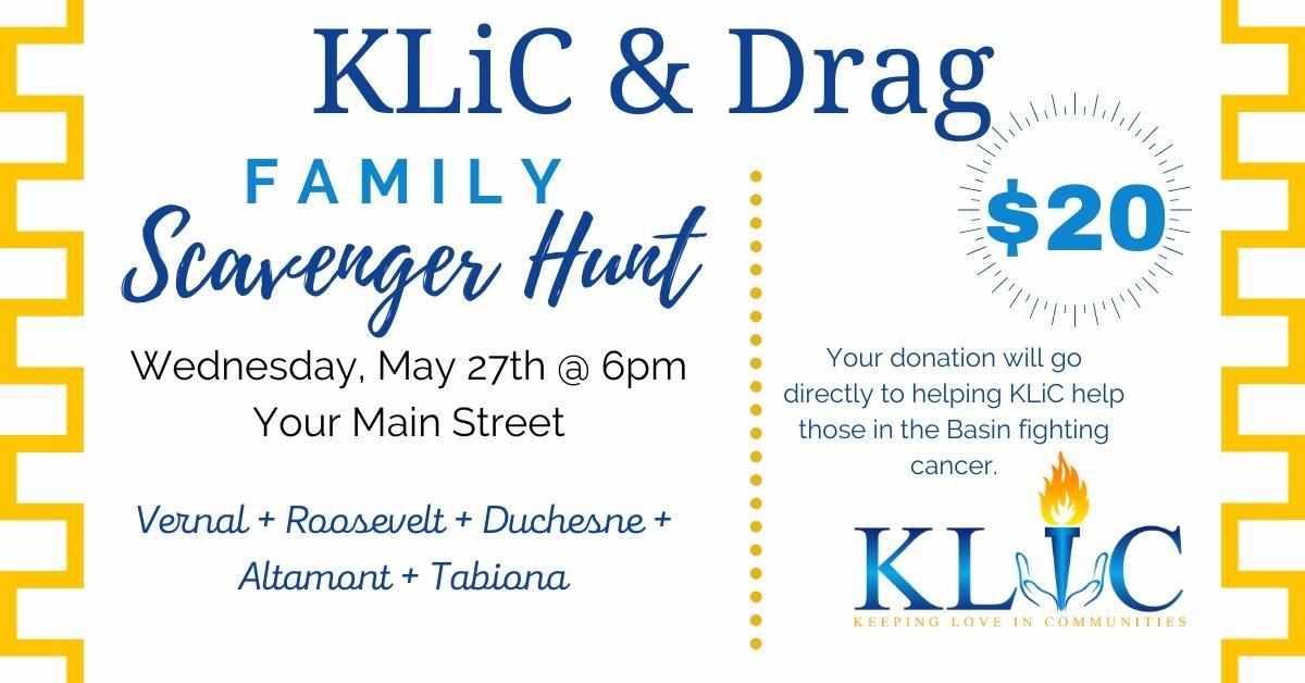 A fun and worthy fundraiser is taking place tonight in communities across the Uintah Basin. The KLiC & Drag Family Scavenger Hunt event starts at 6pm tonight on the Main Streets of Vernal, Roosevelt, Duchesne, Altamont, and Tabiona. KLiC stands for ‘Keeping Love In Communities’. It was created in honor of JoAnn Ivie Coil who passed away from cancer in 2008. The funds donated to KLiC are used to help Uintah Basin families suffering from cancer. For tonight’s fundraiser, starting at 6pm participants can buy a flag for $20 to decorate in support of those fighting cancer and pick up details on the scavenger hunt. Then from 7 to 8pm all are invited to drag their Main Street to complete their scavenger hunt to win great prizes. Each scavenger hunt has 12 items that participants will need to find and take a picture with to then send in. To pick up your flag and participate tonight, stop by your Main Street location: Tabiona High School, Swasey’s Other Place in Altamont, Kohls Hardware in Duchesne, Frontier Grill in Roosevelt, and JB’s in Vernal. Enjoy getting out with the whole family to complete a scavenger hunt while dragging Main Street for a great cause!