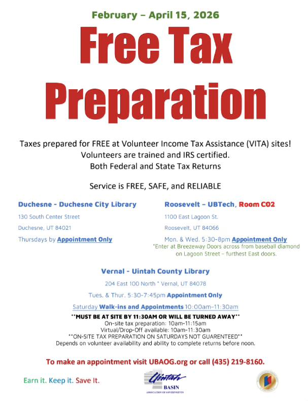 If you still need to do your taxes but could use some help, VITA Free Tax Prep is available locally to assist for one more week. VITA stands for Volunteer Income Tax Assistance. It is an IRS-sponsored initiative that helps provide free, basic tax return preparation for both federal and state tax returns until mid April. VITA services are available by Appointment Only in Roosevelt at UBTech on Mondays and Wednesdays, in Duchesne at the Duchesne Branch Library on Thursdays, and in Vernal at the Uintah County Library on Tuesdays, Thursdays, and Saturdays. The only walk-in opportunity is at the Uintah County Library on Saturdays from 10 to 11:30am. To make an appointment, visit UBAOG.org or call 435-219-8160.