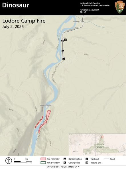 The Lodore Camp Fire that was discovered on July 1st east of the Green River and just south of the Lodore Campground within Dinosaur National Monument is 90% contained as of Wednesday evening. “The fire became established on the east and west sides of the river overnight, but firefighters were able to access and engage both sides of the fire [on Wednesday],” shares the update. “Firefighters worked throughout the day to build the containment line and cool hot spots with aerial support from a Forest Service contract helicopter, which provided water drops. The Colorado Division of Fire Prevention and Control multi-mission aircraft was used to get aerial reconnaissance and to map the fire’s perimeter, which was found to be approximately six acres.” It was also announced that some river trips were delayed due to the fire activity and helicopter operations but trips are expected to continue as planned without interruption in coming days. Boaters are also encouraged to stay alert and remember that fire danger is currently high. Updates are being provided at the Dinosaur National Monument Facebook page.