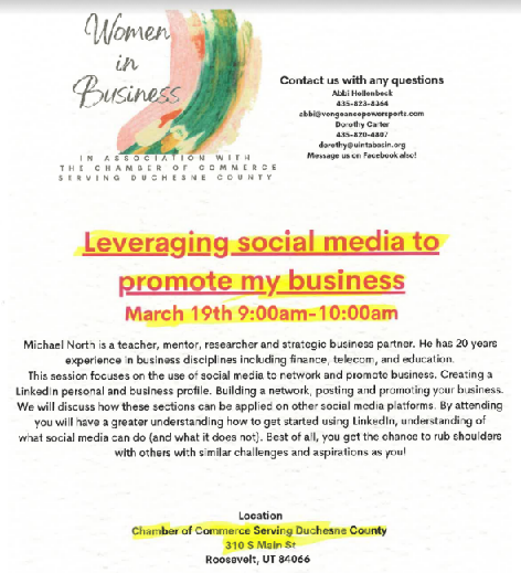 my Business’ training on March 19th at 9am at the Chamber office in Roosevelt. Finally,