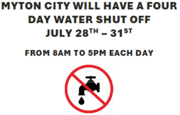 Water difficulties in Myton City continue as the City works to repair lines and address issues. Scheduled water outages have become common with residents used to storing water for use during disruptions of several hours to even longer. All that has led to a longer and needed disruption. The announcement states that Myton City will have a four day water shut off during the hours of 8am and 5pm each day. Citizens are asked to make arrangements during daytime hours from July 28th through July 31st. There will be water and porta potties located at Myton City’s Legion Hall. The Hall will also be open to provide a cooling center for those that use swamp coolers in their homes. Those affected are encouraged to download the Myton City App and to allow push notifications in order to be notified when incidents and events are happening in Myton City.