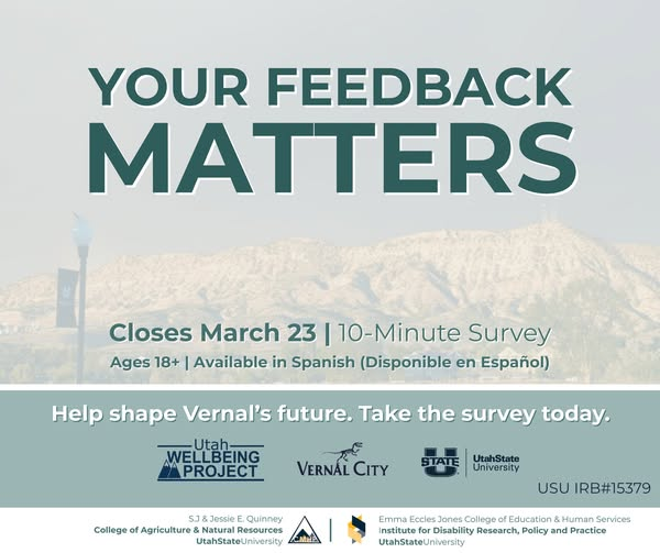 You may have heard by now that Vernal City is inviting residents to take a Community Wellbeing Survey but this message is also for those beyond Vernal City limits. Naples City has also partnered up to encourage their residents to participate in the survey in collaboration with Vernal City and USU. In fact, the survey is for anyone in Vernal and its surrounding area. “The survey takes just 5–10 minutes and will help guide future decisions about planning, services, growth, and quality of life in our community,” shares the announcement. “If you live locally, please take a few minutes today to share your perspective. Every response matters.” Take the survey at tinyurl.com/Vernal2026 or link through the Vernal City website. The link is also available on the Naples City Facebook page and Vernal City Facebook page.