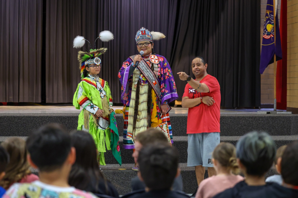 Naples Elementary 3rd graders enjoyed a special opportunity learning from one of their classmates last week. Wilber Cervantes was joined by his father, Brian Cervantes, and sister, Lamona Blackhorse, on Friday to give a presentation on their Native American culture and traditions. Naples Elementary shared that the 3rd graders have been studying the history, traditions, and culture of Native Americans in language arts and Wilber and his family not only presented but also performed for the students. Wilber’s sister Lamona is Miss Native American Uintah High School. She and Wilbur each performed 2 dances for the students. They taught about the different styles of dance traditionally performed by men and women and answered questions from the students. It was a memorable experience for all!