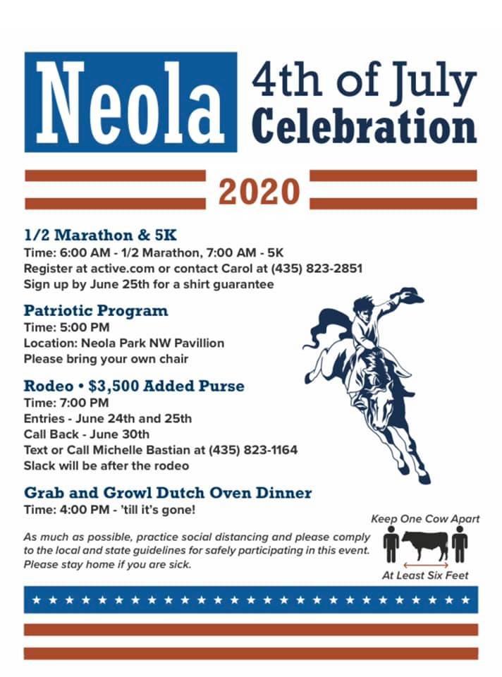 While much of the state is limiting celebration options for this holiday weekend, the Uintah Basin has a long list to choose from. Among those is the Neola 4th of July Celebration. Like their poster says, they might ask that everyone “Keep One Cow Apart” or at least 6 feet but that doesn’t mean there won’t be a lot to enjoy. The day starts off with a half marathon and 5K. That evening kicks off with Grab and Growl dutch oven dinner running from 4pm ‘till it’s gone! At 5pm, there will be a patriotic program at the Neola Park North West Pavillion then the rodeo starts at 7pm. Keeping safety in mind, event organizers are asking all to practice social distancing and comply with local and state guidelines. Please stay home if you are sick. For more information on the Neola Fourth of July Celebration, visit the Neola Fourth of July Celebration Facebook page.