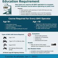 Utah Division of Natural Resources wants to remind the public that there is a new law for Off-Highway vehicle operators in Utah. The new law requires all OHV operators to complete an OHV education course before operating on public land. The course is required for EVERY OHV operator, no exceptions. Those who are below 18 years are required to take the Youth OHV Safety Course for $35 or an approved in person hands on skills course and exam. Those over 18 take the free online course that can be completed in 15 to 30 minutes. It is a once in a lifetime course and the digital certificate can be saved or printed for proof. Those that operate Type 1 ATV, Type II UTV or Side-by-side, Type III OHV, Off-Highway Motorcycles, as well as street legal Off-Highway Vehicles will need to take the course. Individuals will not be able to rent an OHV unless the operator has proof of completing the course. Those that are non-resident visitors will need to complete the course before operating in Utah and purchase the non-resident OHV permit. Go to ohv.utah.gov to take the course or learn more. The law went into effect January 1st and has been enforced since February 1st.