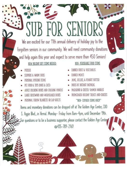 If you’re looking for an opportunity to serve local senior citizens this holiday season, there’s a few easy ways. One simple way is by visiting the Museum of Uintah County to make holiday cards for local seniors. There is a card-making station to make cards there or you can drop off cards you’ve made at home, but no glitter please. Cards are being gathered through December 15th. Also, it’s the 11th annual delivery of holiday joy to over 450 forgotten seniors with Sub For Seniors. Donations of new holiday gift items and non-perishable food items can be donated at the The Golden Age Center on Aggie Blvd during their business hours through December 19th. Monetary donations are also appreciated. Questions can be directed to the Golden Age Center at 435-789-2169.