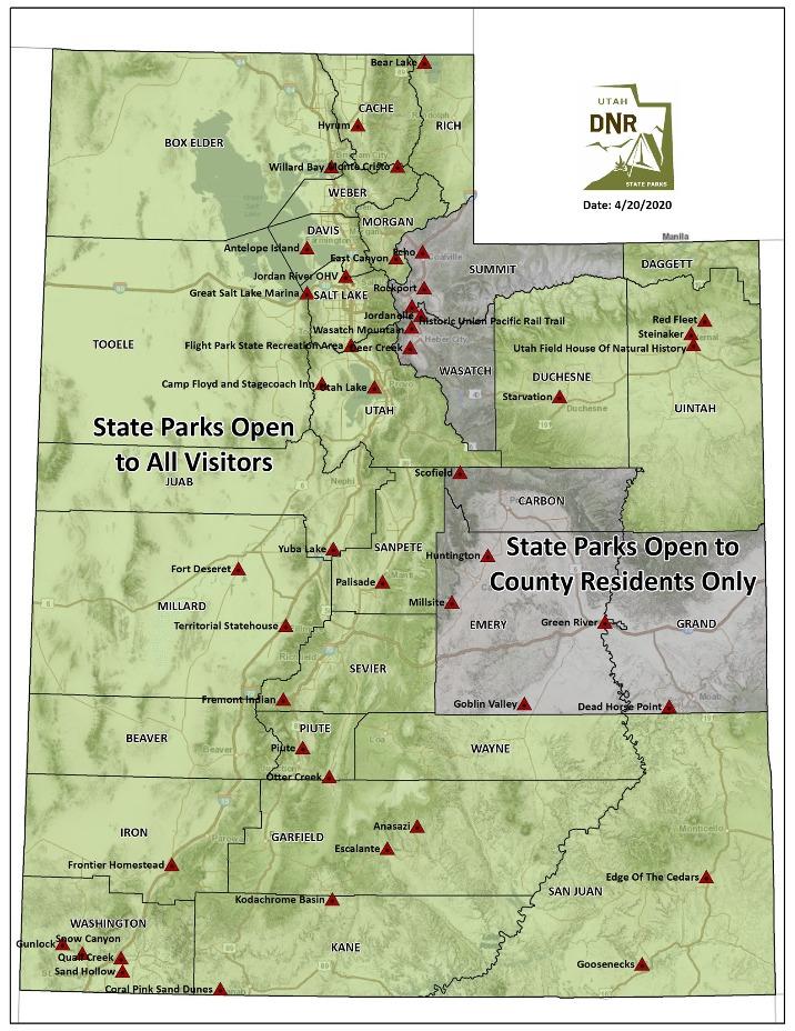 State parks located in Daggett, Uintah, and Duchesne Counties are no longer restricted to residents only residing within each county. The Utah Department of Natural Resources announced Friday that Governor Herbert had lifted the restrictions on all Utah State Parks and the only state parks that remained restricted were due to local health orders. At that time, Uintah Basin counties remained listed as restricted but on Monday the three counties in the TriCounty Health District were removed from the restricted list. As of Monday evening, only Summit, Wasatch, Carbon, Emery, and Grand remained on the restricted list where only residents could visit state parks in their own county. Still, the Utah Department of Natural Resources is urging all to practice responsible recreation, continue social distancing, and do not visit a state park if you have been sick.