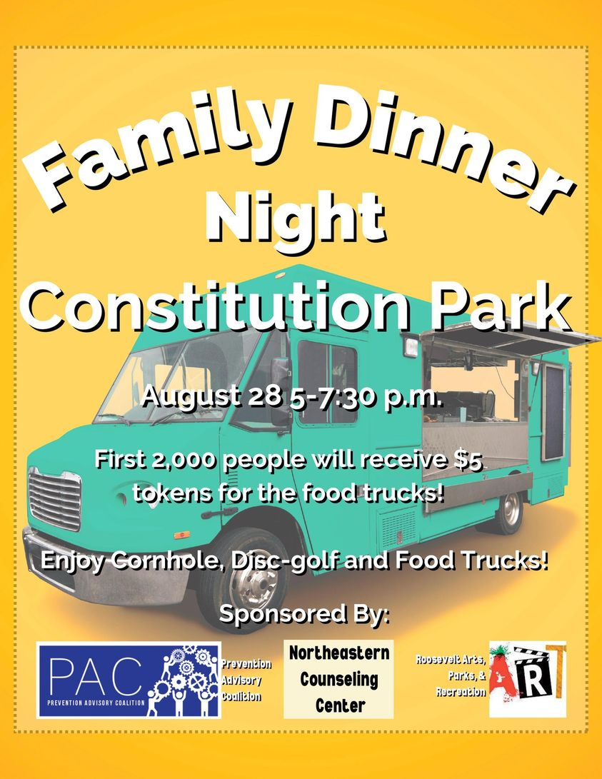 If you haven’t gotten into the spirit of fun this summer there’s still time, especially in Roosevelt City. Today the community is invited for some family friendly fun at Roosevelt’s Central Park for frozen treats and play time under the new playground shade structure. At noon on August 21st, the community is invited out again, this time to the Constitution Park walking path to attend the Sports Complex groundbreaking event and to enjoy free hotdogs. Then on August 28th a favorite event is back with Family Dinner Night at Constitution Park. The first 2000 people to attend will receive $5 tokens to spend at the variety of food trucks that will be there. The event, which is sponsored by Northeastern Counseling Center, the Prevention Advisory Coalition, and Roosevelt Arts, Parks, and Recreation, lasts from 5 to 7:30pm and all are invited!