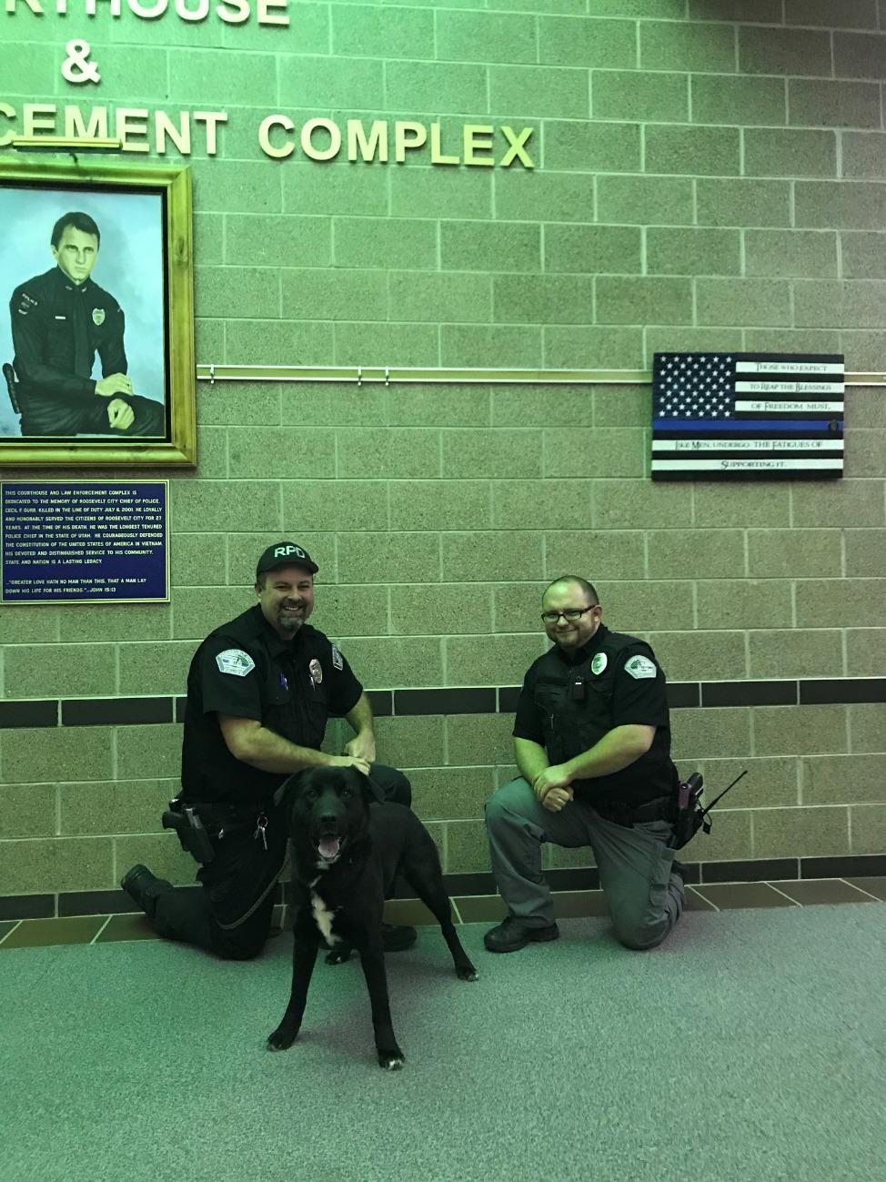 Roosevelt City Police Department has welcomed a new officer with a great nose. Tips, a mixed-breed narcotics K-9, was certified last week with his handlers, Officer Harrison and Officer Knight, and performed exceptionally well. Roosevelt Police now has three K-9s and four handlers, shares Roosevelt Police Chief Rick Harrison. The K-9s are all narcotics trained and are deployed several times each week on Roosevelt cases as well as with other agencies such as Utah Highway Patrol. “The K-9 officers are responsible for numerous cases leading to the detection of illegal narcotics and the arrest of those dealing in illegal narcotics,” shares Chief Harrison. “K-9s are a valuable tool law enforcement has available to help keep our communities safe.” Tips joins Lila, a Belgian Malinois, and Lucy, also a mixed breed dog, on the Roosevelt Police K-9 team. Tips was donated by The Next Level Canine owner Tim Adams.