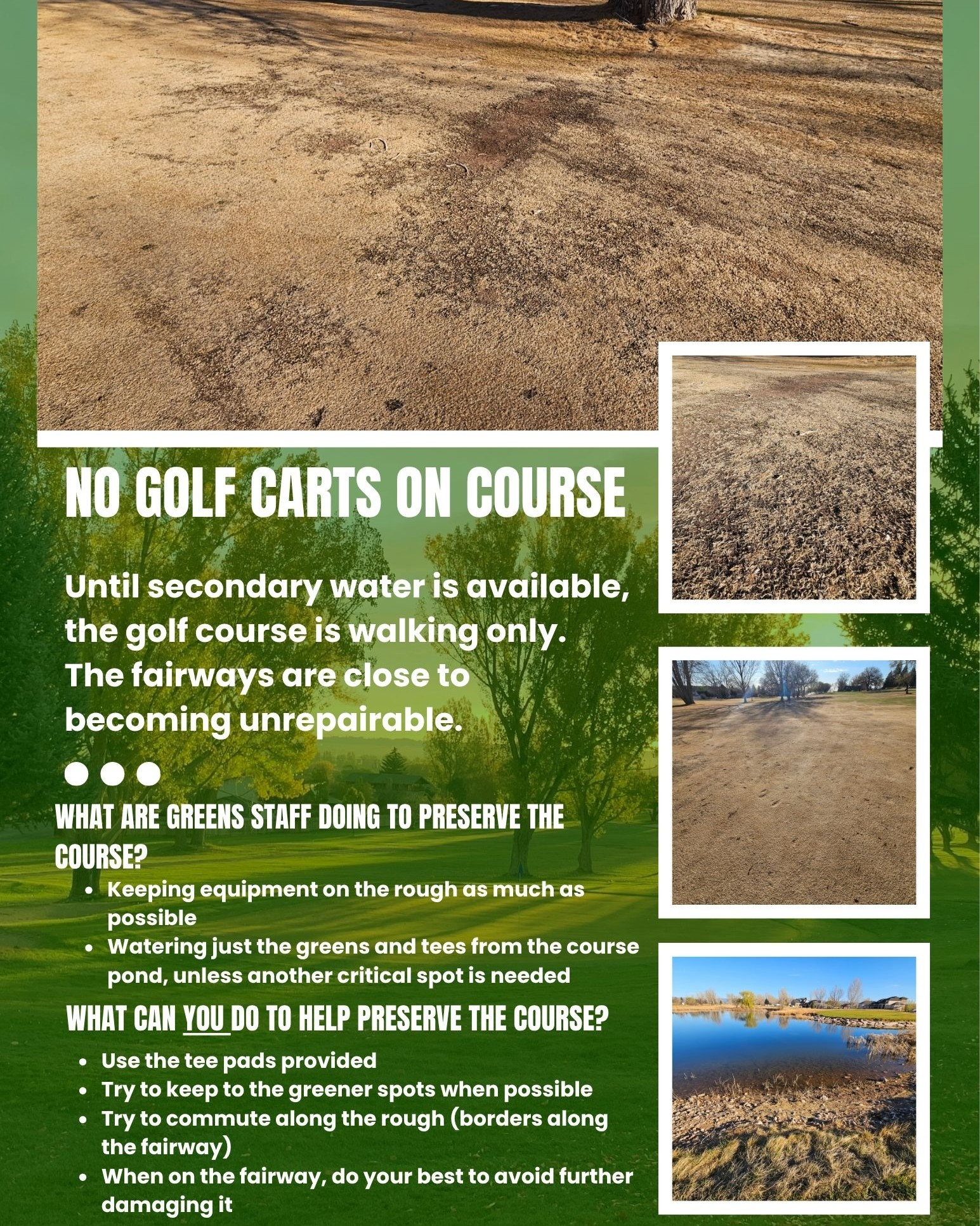 Roosevelt City has a few reminders for those excited to get on the golf course. The golf course has opened early but there will be no golf carts permitted on the course at this time. “Due to the extremely dry winter and spring that we have had, we will be needing to make some changes to the golf course to prevent unrepairable damage to the fairways,” shares the announcement. “Until secondary water is available, the golf course will not be allowing golf carts on the course. Players can still play, but it will be walking only until the fairways can be watered. So far this spring, the number of carts on the fairways have pushed the fairway grass past what it can handle with how hot and dry this winter and spring have been.” Public Works is tentatively planning to turn on secondary water for the season around April 15th.