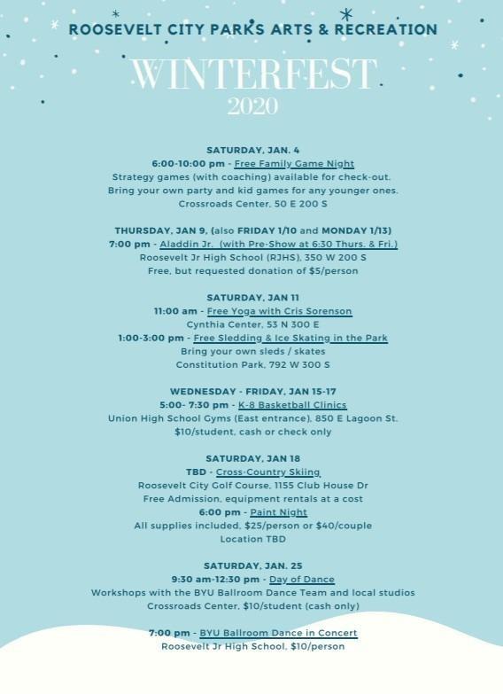 Roosevelt is in the middle of its Winterfest fun. This weekend there are three activities to enjoy. First, the Roosevelt Aquatic Center will be offering discounted admissions for open swim, which will be every Saturday in the month of January. Second, there will be a Winterfest Paint Night. For $25 per person or $40 per couple all supplies will be provided for any skill level. There is limited capacity for the event at the Villa on Saturday from 7pm to 9pm. The third event is the activity that started Winterfest, cross-country skiing. Individuals need to bring their own gear (or borrow from a neighbor) to the Roosevelt Golf Course on Saturday at 10am and will go until 12pm.