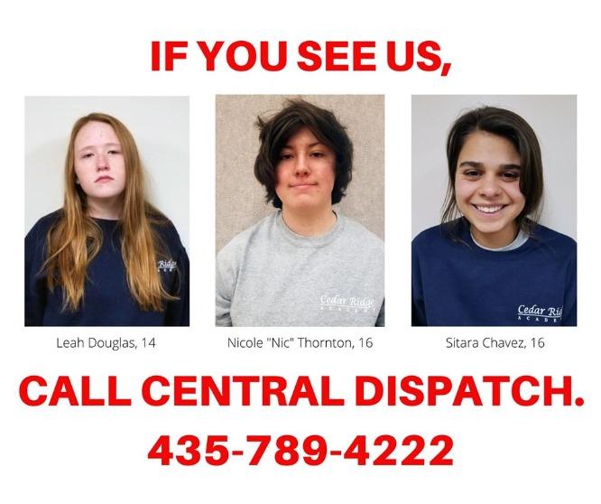 Search and Rescue have been called out in the search for three juveniles reported as missing/runaway in Duchesne County. According to the Duchesne County Sheriff’s Office, three teenage girls walked away from Cedar Ridge Academy, a private residential treatment center for youth, near Roosevelt early Monday morning at about 1am. The Sheriff’s Office shared that they are searching for: ¨Leah Douglas, 14, who is 4’ 7” tall and about 105 pounds. She was last seen wearing a green shirt with the words “Cedar Ridge” on it. Nicole “Nic” Thornton, 16, who was last seen wearing a red sweater with the words “Cedar Ridge” on it. She is 5′ 3″ tall and about 150 pounds. Sitara Chavez, 16, who is 5’ 4” tall and about 115 pounds. She was last seen wearing a blue sweater with the words “Cedar Ridge” on it.¨ Anyone with information is invited to call the Duchesne County Sheriff’s Office at 435-738-2015 or Central Dispatch at 435-789-4222. The Duchesne County Sheriff´s Office press release also included the following message: ¨To Leah, Nic and Sitara: If you see this post, please call the sheriff’s office or Central Dispatch to let us know you are safe.¨