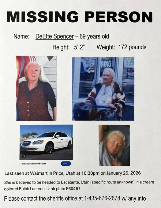 Vernal is among the known stops a missing woman made during the last week of January and the public is asked to share any tips or leads in the case. The Silver Alert was issued for 69-year-old DeEtte Spencer who was last seen at Walmart in Price on January 26th. Officials shared that on January 24th, surveillance photos show that DeEtte was in Vernal before heading to Colorado. It was believed after leaving Walmart in Price, her plan was to head back home to Escalante in southern Utah’s Garfield County. She was traveling in a cream colored Buick Lucerne car. If anyone has any information on her whereabouts, please contact the Garfield County Sheriff’s Office at 435-676-2678. Images are shared with this story on BasinNow.com.