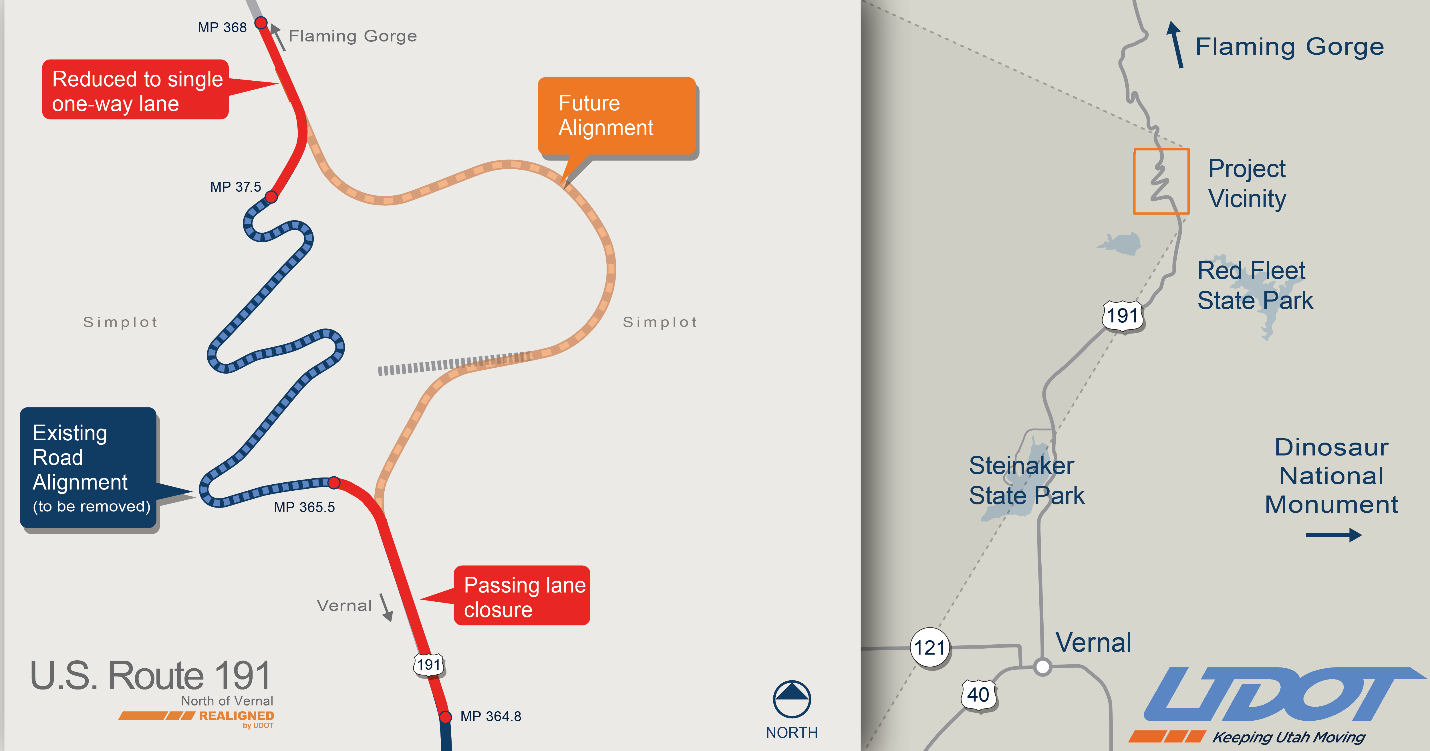 Work continues on an important road project north of Vernal and travelers are urged to consider construction before traveling through the area. The Utah Department of Transportation completed the tie-in for the south portion of the US-191 Realignment Project and now work will begin at the north end. “UDOT will reduce US-191 to a single one-way lane near milepost 368, as part of the US-191 Realigned project on August 11th,” shares the announcement. “The closure is expected to last about four days when the new alignment is opened to two-way traffic. This closure will help facilitate work to integrate the new US-191 alignment with the existing road. The road will be reduced to a single one-way alternating lane for about 0.1 miles. Flaggers will be stationed at the top and bottom of the closure. Motorists are advised to stay alert and remain cautious through these areas as heavy equipment enters and exits the work zone.” Recreational motorists are encouraged to avoid delays by avoiding the route. The US-191 Realignment Project has replaced a 2.6 mile switchback portion of the highway to a new alignment with fewer turns and standard horizontal curves.