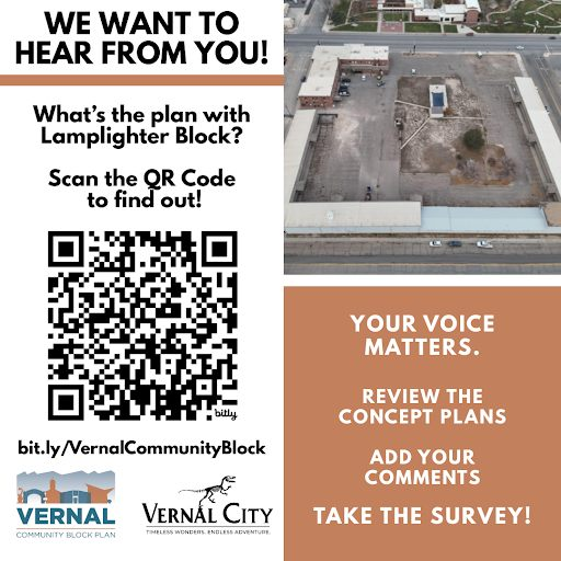 The survey available to provide your feedback on the released concept plans for the Lamplighter Block is still open but that won’t be the case forever. It was announced during the Vernal Chamber luncheon that those who haven’t filled out the survey yet need to make it a priority before it closes. The designs are shared through a survey that allows for feedback on 3 concepts and style preferences. The first stage of community engagement took place earlier this year when 752 online survey responses were received and over 50 people chose to attend an open house about the project. The feedback gathered guided the development of the 3 concept designs now shared. The survey allows the viewer to rank the concepts and share specific features and design options that are preferred. A link to the survey is available through Vernal City or with this news story on BasinNow.com.