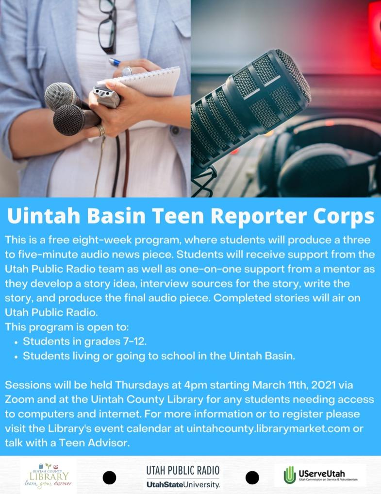 Uintah County Library is gearing up to hosting activities for the community. Uintah Basin Teen Reporter Corps will be starting up a new session on March 11th. This is an eight week program where students will produce a three to five minute audio news piece. This session will be a special water theme that will be part of a traveling exhibit, shares the library. Spots are limited but open to students living or going to school, grades 7th to 12th, in the Uintah Basin. Sessions will be on Zoom and computers at the library can be used. There will also be a series of virtual classes for teens and young adults called Adulting 101. The classes will be online with kits with the basic supplies available for pick up at the Teen Zone during hours. To register for events and learn more details, visit the Uintah County Library Facebook page.