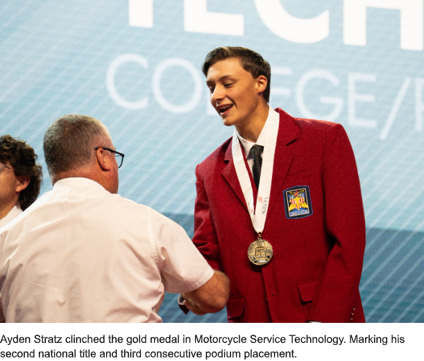 The UBTech Titans received a record breaking 9 national medals during the National SkillsUSA Championships in Atlanta, Georgia. Ayden Stratz received Gold in Motorcycle Service Technology, the Health Knowledge Bowl Team of Ariana Bess, Jessica Hatch, Dacey Jorgensen, and Evelyn Woodland received Silver, and there were 4 Bronze medalists: Merek Sharp in Medical Math, Strayden Olsen in Welding, Pierce Woodward in Carpentry, and Wyatt McKee in Power Equipment Technology. UBTech sent 32 students to represent Utah at nationals and 24 of those placed in the top 10. “This year is another remarkable chapter in UBTech’s SkillsUSA legacy,” shares UBTech President Aaron Weight. “To consistently produce national medalists year after year speaks volumes about our students, faculty, and the culture of excellence here at UBTech.” Strayden Olsen’s medal adds to his Gold from last year making him a two-time national medalist. The Gold medal for Ayden Stratz was his second national title in Motorcycle Services Technology and his third consecutive podium placement.