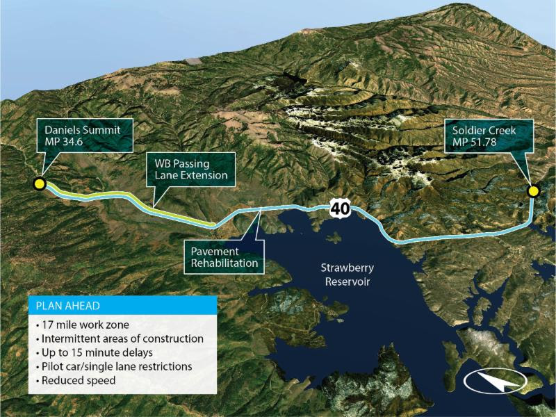 UDOT provided a construction update on the Strawberry Valley Highway 40 project on Thursday. As always the take home message is that all travelers need to plan ahead for construction delays, allow extra travel time, and take alternate routes when possible. Crews continue asphalt removal operations between Mile Post 37 and 40.6. Up to 15 minute delays are possible in this section. Asphalt paving operations are ongoing between Mile Post 46 and 52. Crews are replacing the final layer of asphalt and there are areas of loose gravel. Drivers are urged to slow down and be aware of moving equipment and shifting lanes. Also, UDOT reminds the public that while the turn lanes at the Strawberry Marina turnoff are closed, access is still available. If traveling in this area please allow extra time and be aware that drivers and recreation vehicles will be slowing down at this location.