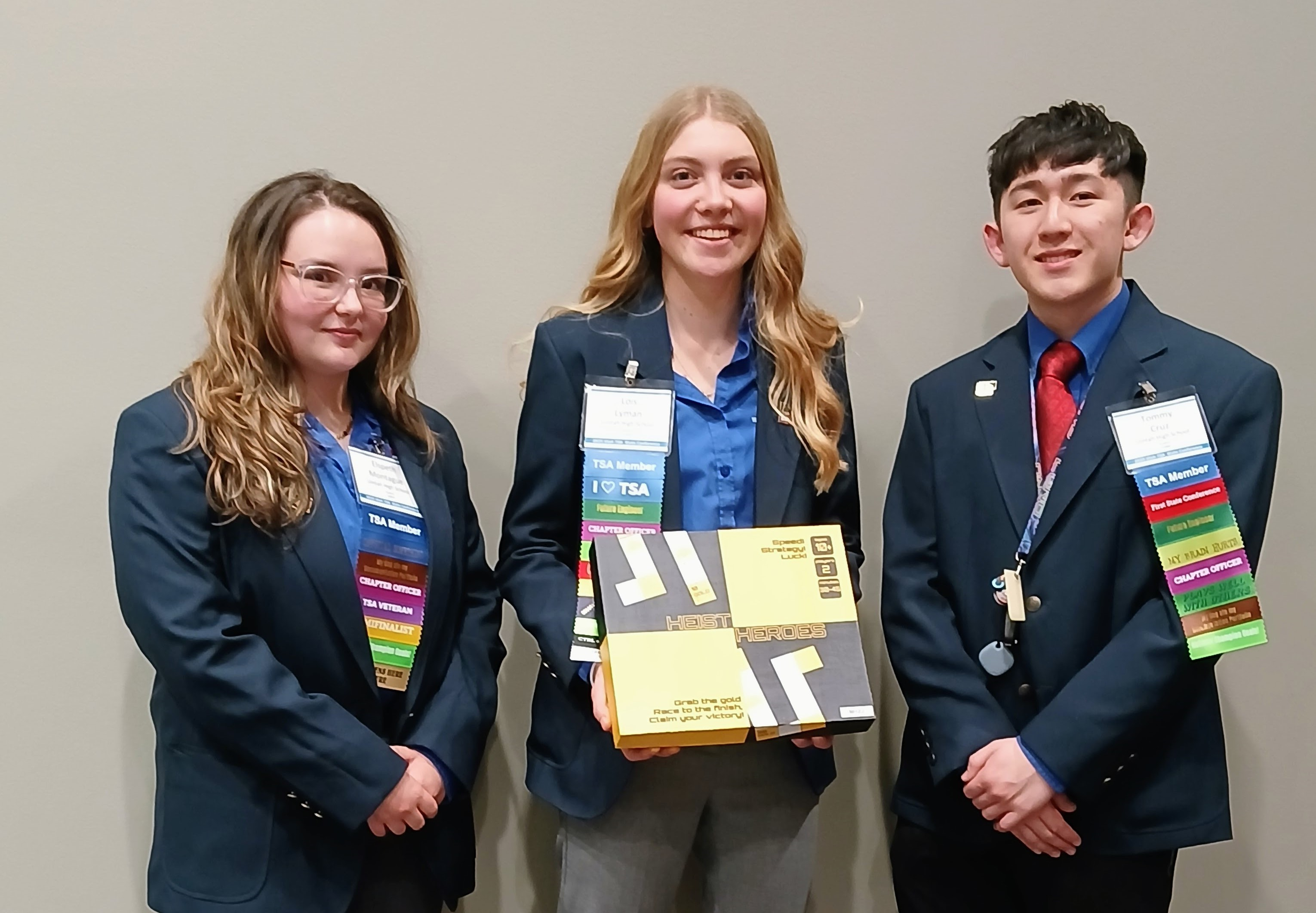 Uintah School District announced that three Uintah High Technology Student Association leaders recently returned victorious from their state conference in Provo. Lois Lyman, Tommy Cruz IV, and Elspeth Montague took 2nd place with their entry in Board Game Design, culminating months of hard work. Cruz also placed 1st in the grueling 3-hour CAD-Engineering session. “It was a fantastic showing,” shares Uintah High teacher Joseph Woodard. “Way to represent our school so well!” These three amazing students are raising money now to attend the national competition in Nashville this summer. The trio’s board game is a Robin Hood-style robbery game where players race to collect gold and escape an evil bank. They created all the graphics for the box and board and 3D printed all the parts. The group is raising funds to compete at the National TSA Conference. If you would like to donate or learn more about how you can support them, reach out to (435) 219-5021 or elspethm503@gmail.com. Donations will be accepted through Venmo @elspethm. Support can also be given by purchasing their handmade board game through the following link: https://forms.gle/YU7VHdUdhUhWDgYC7.