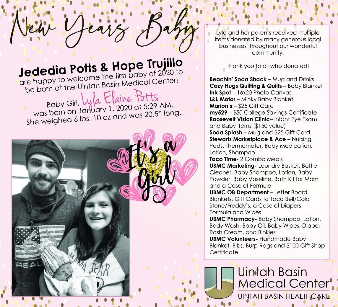 Uintah Basin Medical Center has announced their New Year’s Baby for 2020. Jed Potts and Hope Trujillo welcomed Lyla Elaine, their healthy baby girl, to the world on New Year’s Day at 5:29am. Lyla weighed 6 pounds 10 ounces and was 20 ½ inches long. Lyla and her parents received a special basket full of generous donations from local businesses so while Lyla enjoys her new minky blanket and baby items, mom and dad can be treated with dinner for a few nights using gift cards as the family settles in. Congratulations Jed and Hope on your exciting new arrival!