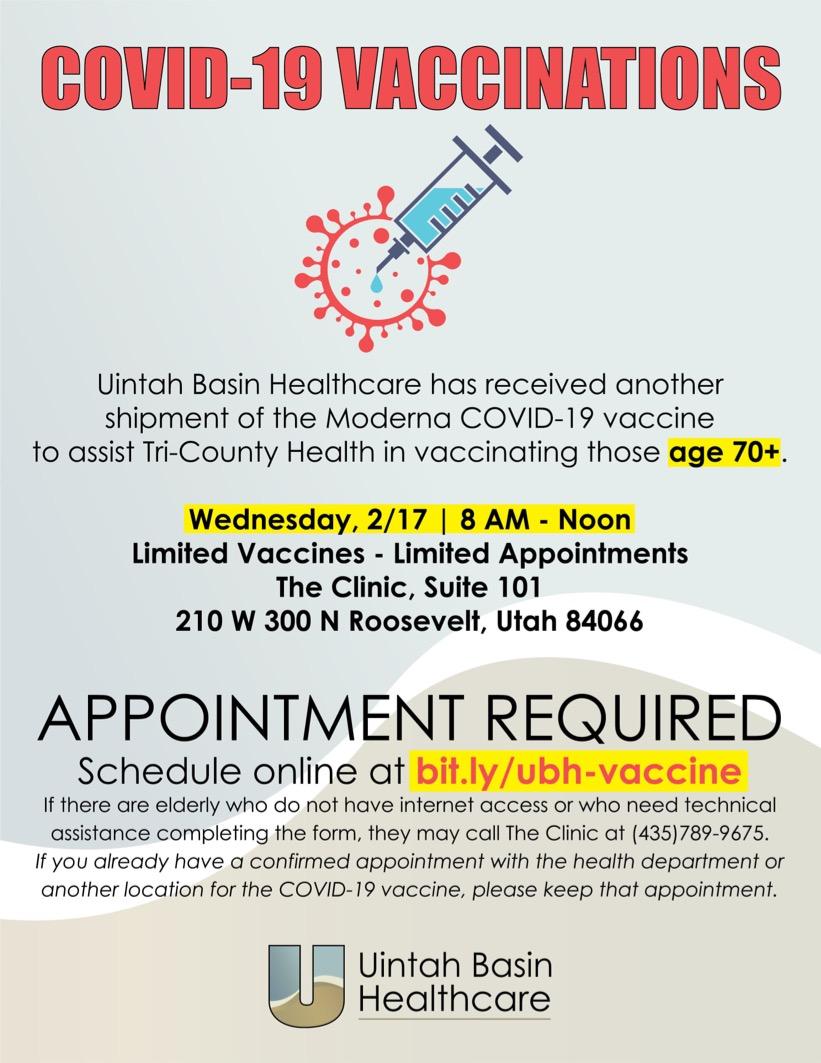 Uintah Basin Healthcare has announced that they have received another limited shipment of the Moderna COVID-19 vaccine to assist TriCounty Health in vaccinating those age 70 and older in our community. The vaccination event will be held Wednesday, February 17th from 8:00 AM to noon at Uintah Basin Medical Center. “If a patient is immobile and unable to exit the vehicle to receive a vaccination, there will be parking spots labeled directly in front of the UBMC Pharmacy where the patient may arrive at the scheduled time, park and follow directions on the sign to be vaccinated,” shares Uintah Basin Healthcare. “If there are elderly who do not have internet access or who need technical assistance completing the form, they may call The Clinic at (435)789-9675.” Appointments must be scheduled online ahead of time.