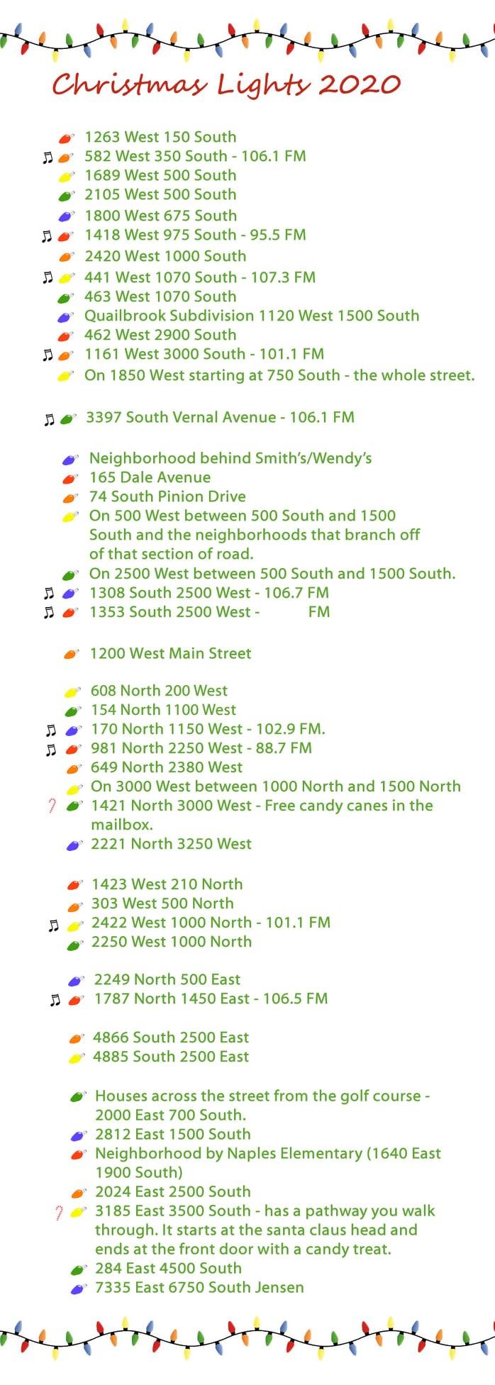 There is Christmas cheer to be found throughout the Uintah Basin in the form of holiday light displays and shows. In the Vernal area there are at least 9 homes with special light shows that are synced to music that can be tuned in on your car radio. A few stops even have candy canes or small goodies for visitors. For those hoping to print a handy list of addresses of where to drive by, visit the ‘Vernal Holiday Lights’ Facebook page. The list has over 25 addresses in a logical order for those out taking a grand light tour! For those in Duchesne County there are of course beautiful light displays throughout the neighborhoods. Always a hit, the Pierces Holiday Light Show located at 4000 North 1000 West in Roosevelt is thrilling visitors nightly through the holiday. If anyone has a handy list of other Duchesne County addresses compiled, feel free to email it to info@basinnow.com and it will be posted with this news report.