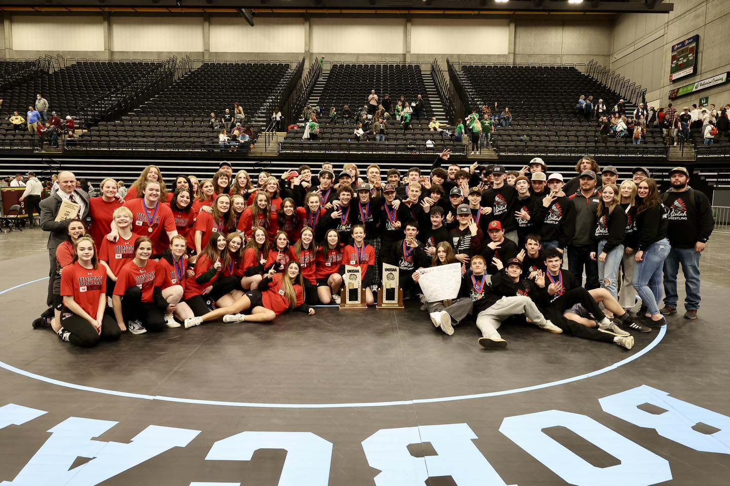 After each having a fantastic season, the Uintah Ute boys and girls wrestling teams have come home from UVU in Orem as state champions. The boys team earned 296 points followed by Payson with 253 points and Wasatch with 234. The girls team earned 208.5 points followed by Cedar Valley with 181 and Springville with 171.5 points. This was the girls first state title and the boys third consecutive state title and 26th title in program history. For the boys, Michael Alexander and Gage Howard won individual titles. For the girls, Chanley Green, Emma Carri and Maddison Tenney won individual titles. Coach Patrick Sharp was named the 5A Girls Wrestling Coach of the Year by his peers.