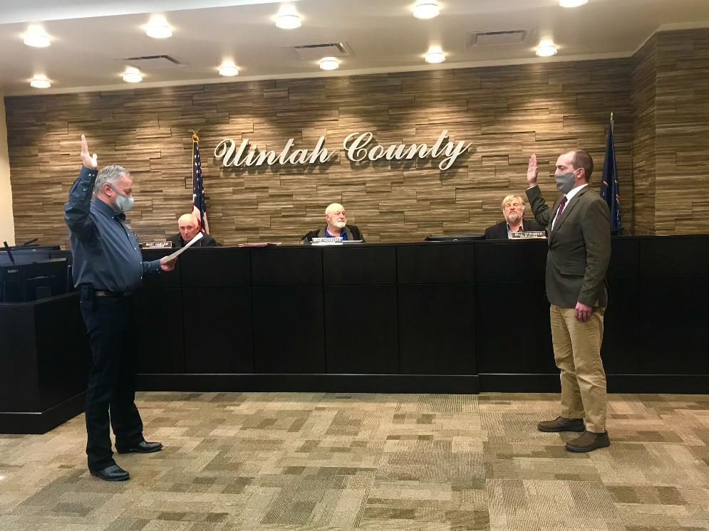 Uintah County Clerk Auditor Michael Wilkins swearing in Jon Stearmer as interim Uintah County Attorney on Monday, January 11, 2021