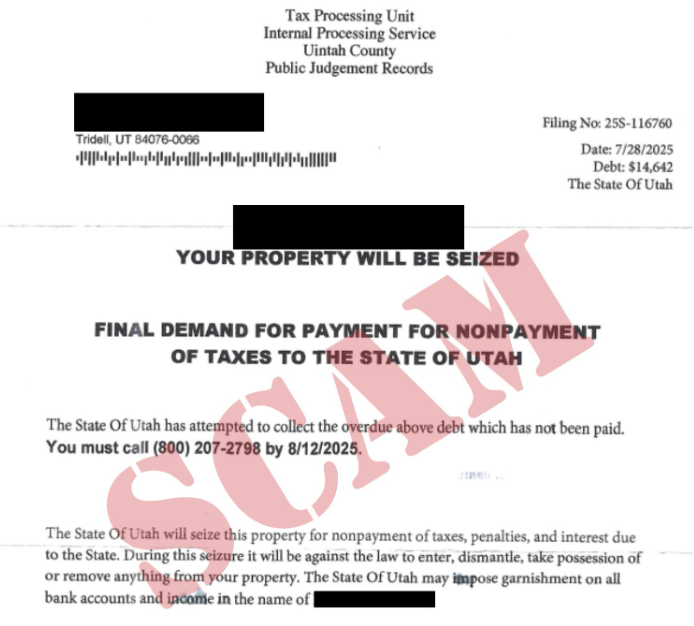 Scams can take just about any form, including the good ol’ fashioned letter in the mail. Uintah County announced last week that citizens have been receiving scam letters that demand payment of taxes and that the property will be seized if not paid. “These letters are not being sent from Uintah County or the State of Utah,” shares Uintah County. “In fact, the office listed on this letter does not exist.” So what should you do if you receive a letter like this? Simply discard the letter and DO NOT contact the number provided. Uintah County shared that they are grateful to those who brought the letter to their attention and encourages anyone who receives this type of letter, email, or phone call to contact the county to verify the information and to report the fraudulent activity. If you want more information, contact the Uintah County Public Information Office at 435-781-6767.