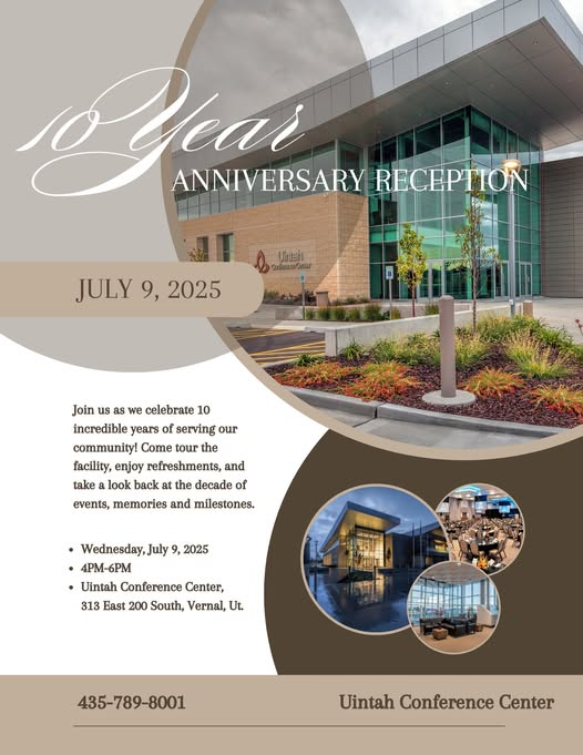 Uintah County has several exciting events coming up this summer. First is an Anniversary Reception celebrating 10 years of the Uintah Conference Center. Attendees are invited to tour the facility and help celebrate a decade of hosting unforgettable events. The celebration is happening July 9th from 4 to 6pm at the Uintah Conference Center. Another upcoming event is the Uintah County Fair. “Get ready for days of fun, food, and fantastic entertainment the whole family will love!” shares the announcement. “From thrilling shows and carnival rides to local talent, exhibits, and unforgettable fair fun- there’s something for everyone under the tent!” This year’s fair is running August 13th through the 16th. For more information, check out www.uintahcountyfair.com.
