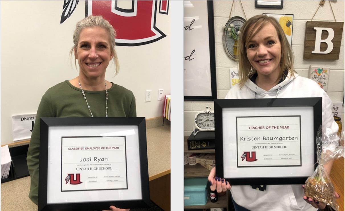 Among the heroes of 2020 were the countless educators who took on the monumental task of continuing to teach students in ever changing circumstances. While every employee could earn an award in their own right, two Uintah High School employees are being recognized for their continued efforts and service. Kristen Baumgarten has been named Uintah High School Teacher of the Year and Jodi Ryan has been named Uintah High School Classified Employee of the Year. “Mrs. Baumgarten teaches in the English department and Mrs. Ryan is the Administrative Assistant at UHS,” shares the district announcement. “These two outstanding individuals were nominated by students, faculty, and staff and then voted on by the UHS Community Council. Congratulations and thanks for making UHS a great place to be!”